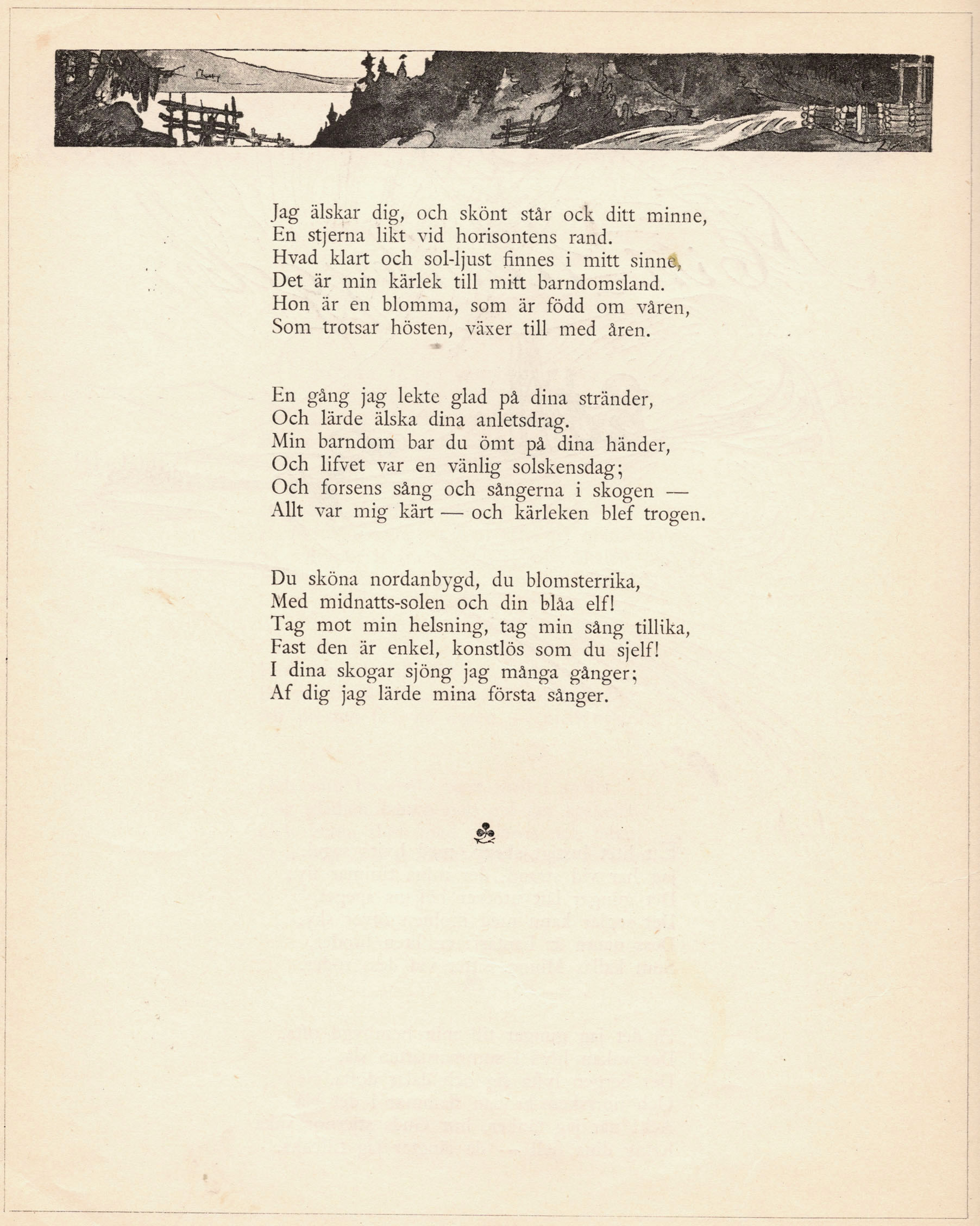 Jag älskar dig, och skönt står ock ditt minne, En gång jag lekte glad på dina stränder, Du sköna nordanbygd, du blomsterrika, |