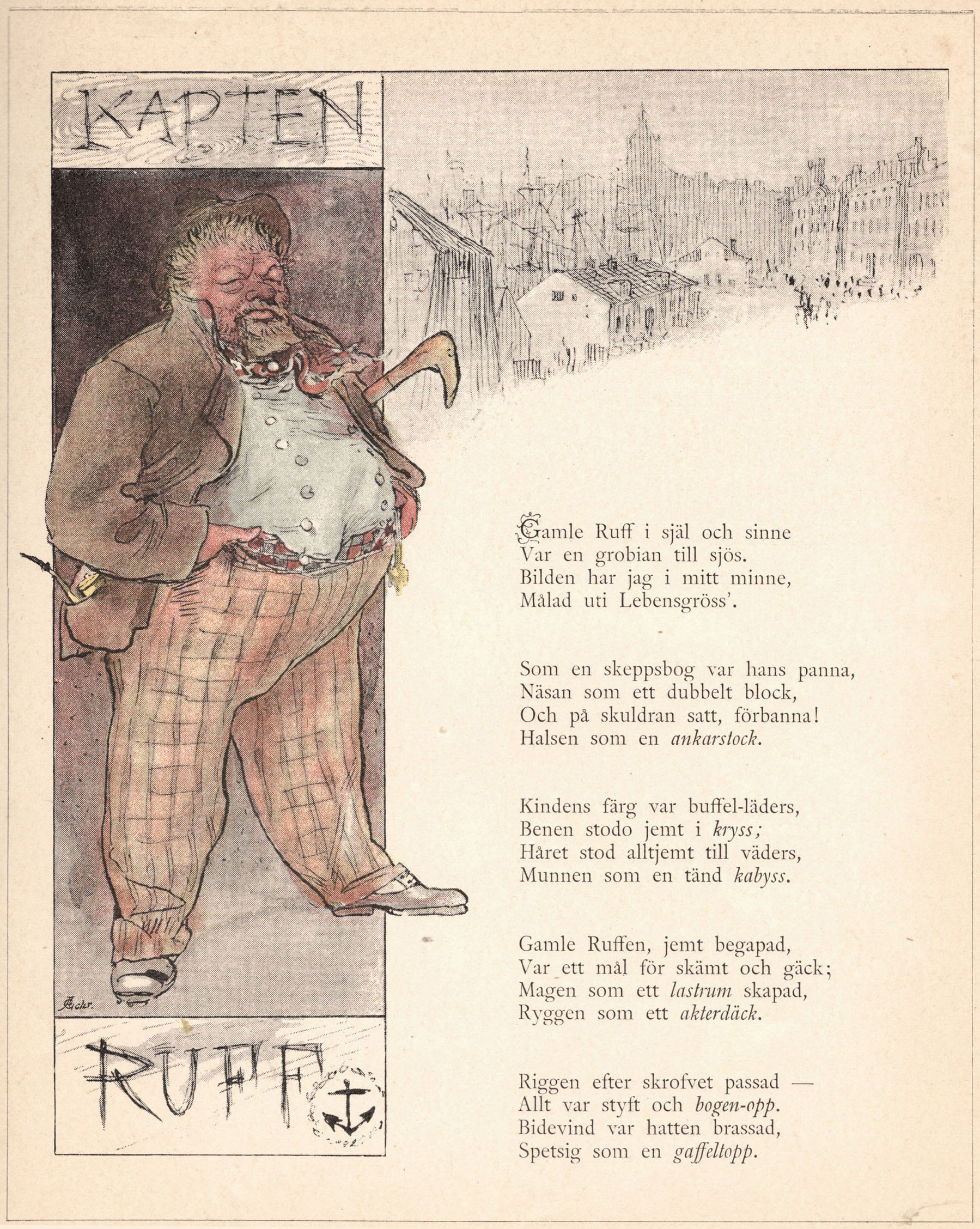 Gamle Ruff i själ och sinne Som en skeppsbog var hans panna, Kindens färg var buffel-läders, Gamle Ruffen, jemt begapad, Riggen efter skrofvet passad — |