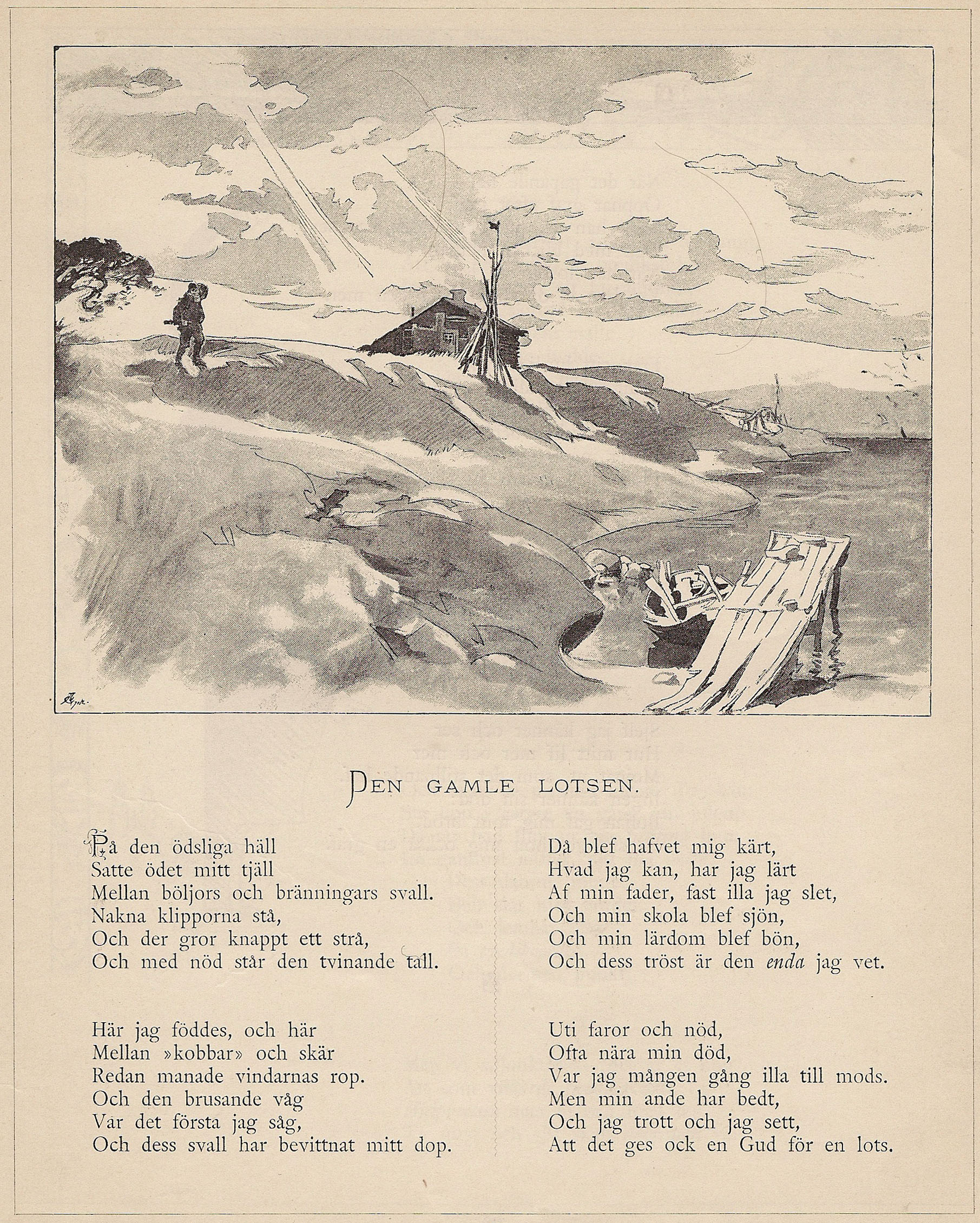 På den ödsliga häll Här jag föddes, och här Då blef hafvet mig kärt, Uti faror och nöd, |