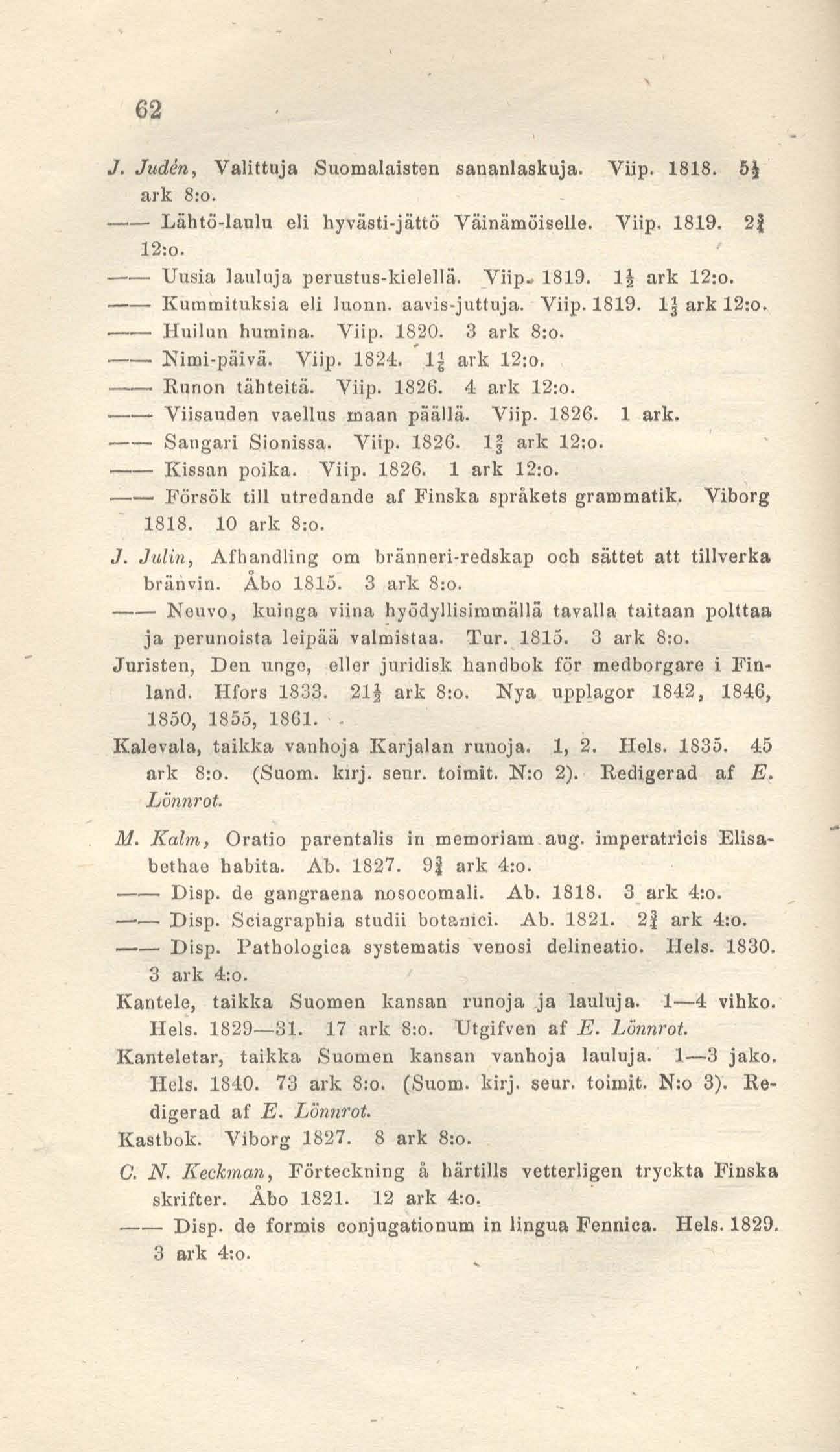 J. Judén, Valittuja Suomalaisten sananlaskuja. Viip. 1818.