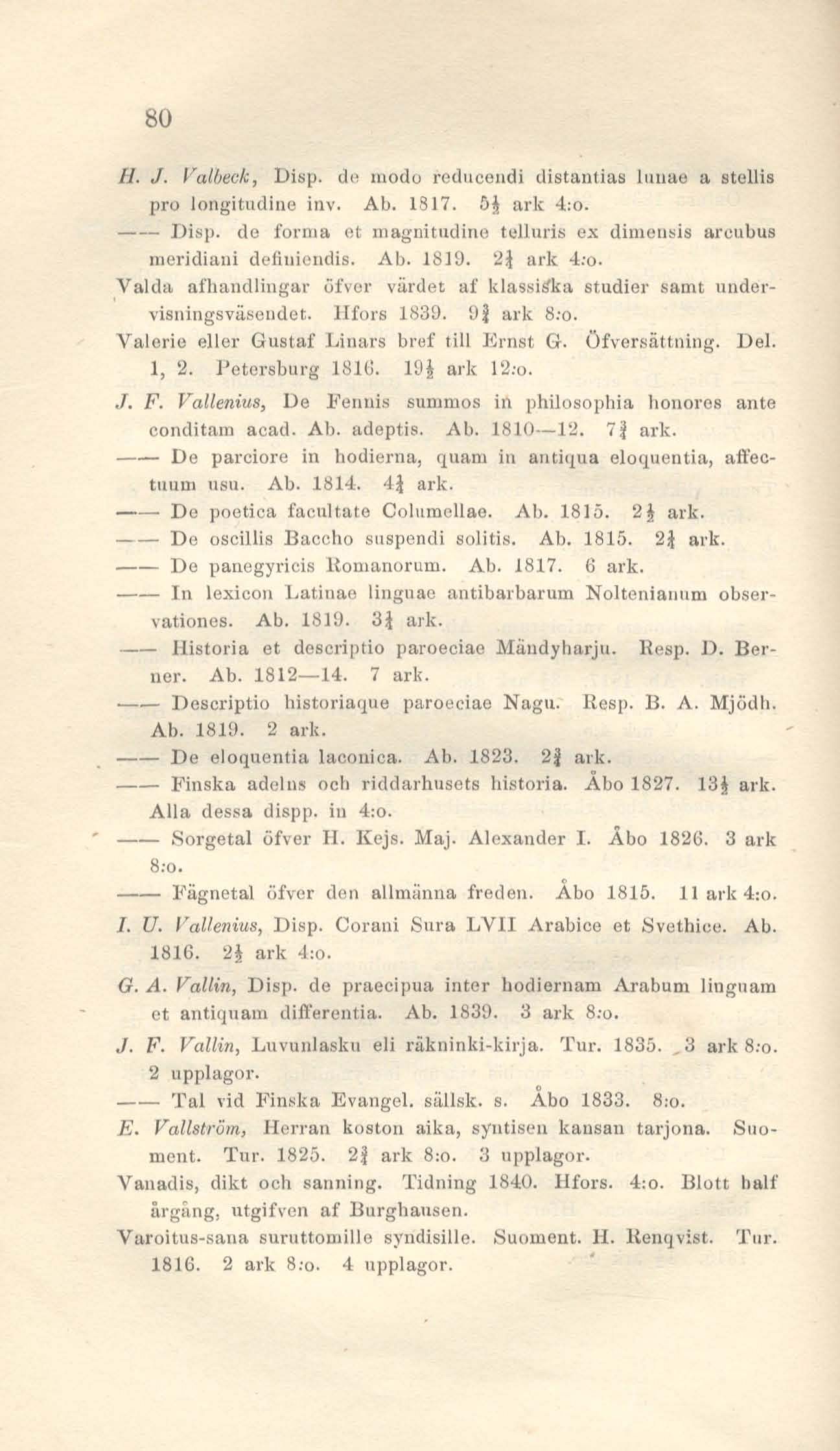 J.	F. Vallin, Luvunlasku eli räkninki-kirja. Tur. 1835. ,3 ark 8:o.