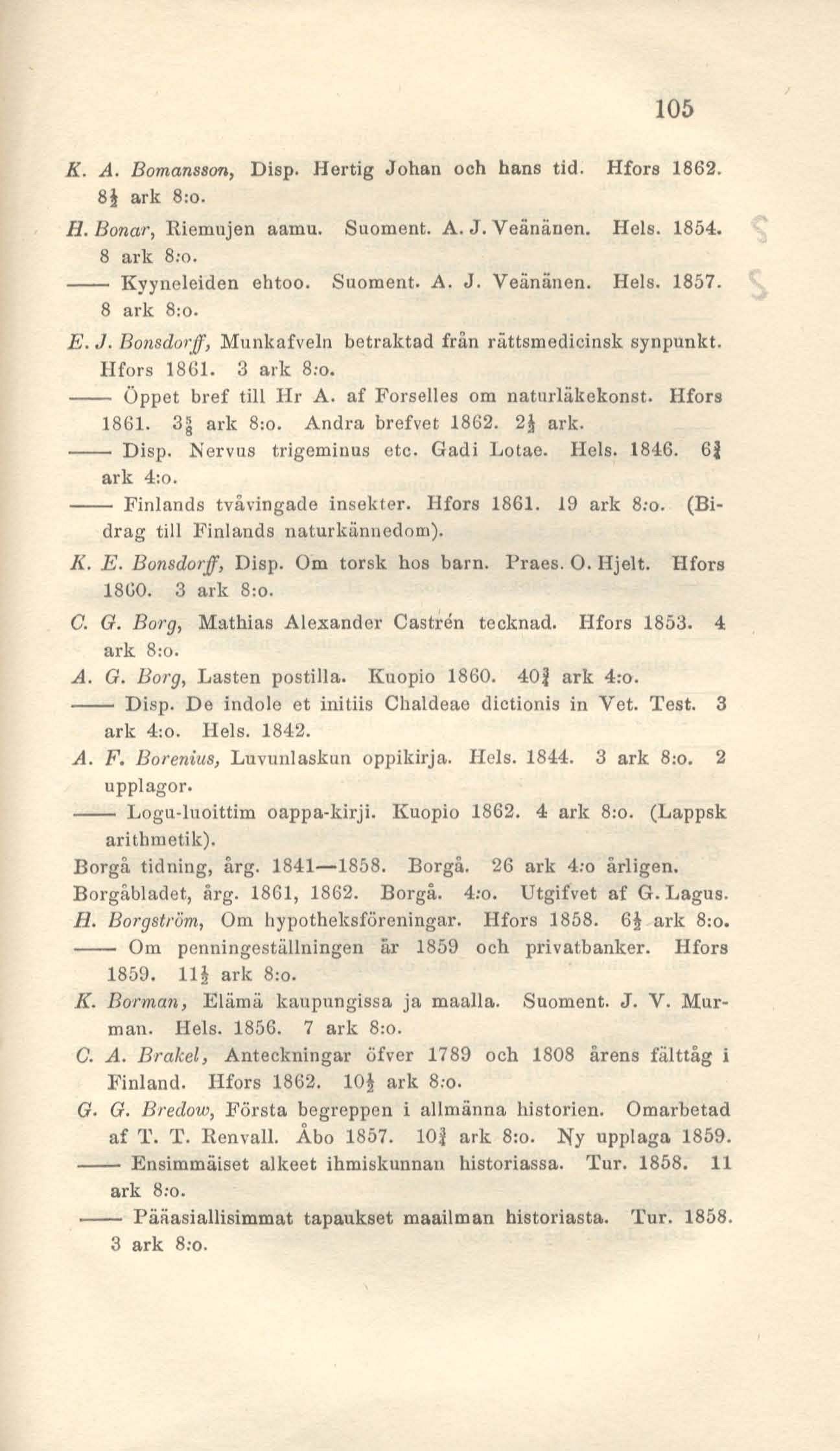 K.	A. Bomanssony Disp. Hertig Johan och hans tid. Hfors 1862.