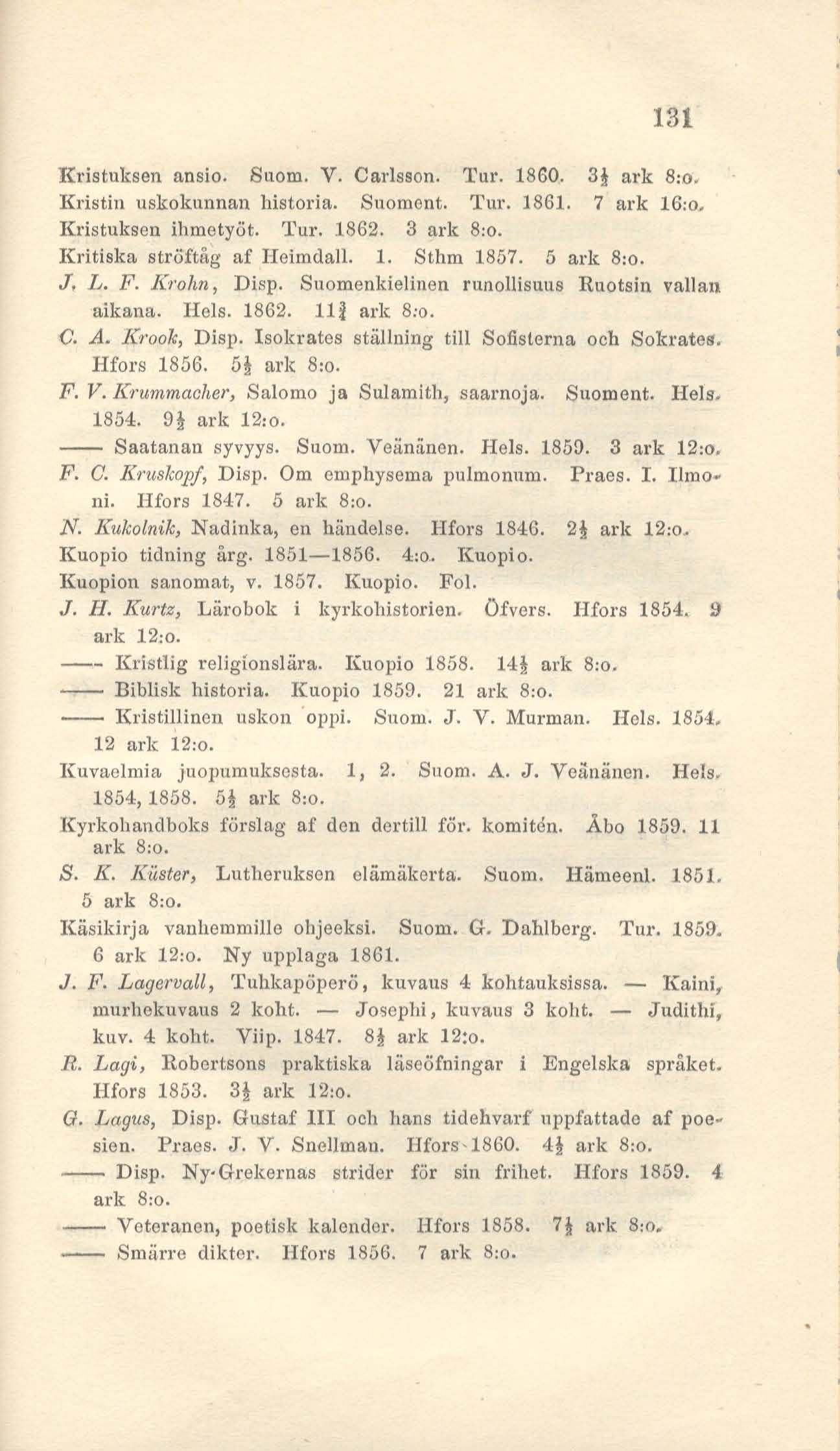 ––Kristlig religionslära. Kuopio 1858. 14| ark 8:o.