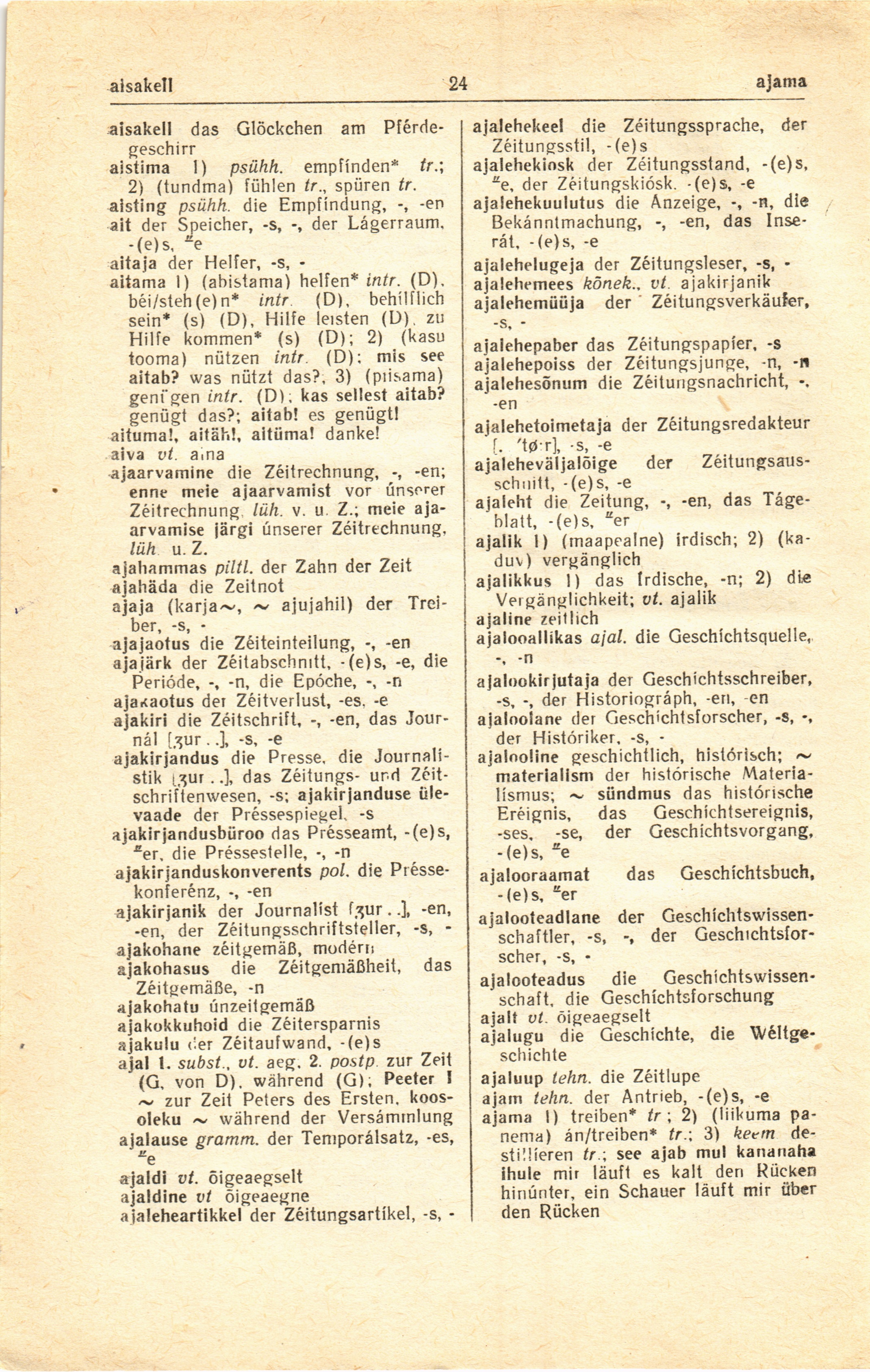 ajal 1. subst., vt. aeg. 2. postp. zur Zeit
