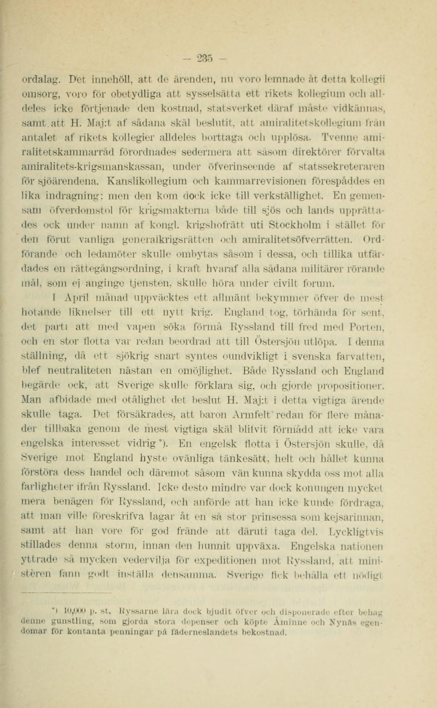 ordalag. Det innehöll, att de ärenden, nu voro lemnade åt detta kollegii omsorg, voro för obetydliga att sysselsätta ett rikets kollegium och alldeles icke förtjenade den kostnad, statsverket däraf måste vidkännas, samt att H. Maj:t af sådana skäl beslutit, att amiralitetskollegium från antalet af rikets kollegier alldeles borttaga och upplösa. Tvenne amiralitetskammarråd förordnades sedermera att såsom direktörer förvalta amiralitets-krigsmanskassan, under öfverinseende af statssekreteraren för sjöärendena. Kanslikollegium och kammarrevisionen förespåddes en lika indragning; men den kom dock icke till verkställighet. En gemensam öfverdomstol för krigsmakterna både till sjös och lands upprättades ock under namn af kongl. krigshofrätt uti Stockholm i stället för den förut vanliga generalkrigsrätten och amiralitetsöfverrätten. Ordförande och ledamöter skulle ombytas såsom i dessa, och tillika utfärdades en rättegångsordning, i kraft hvaraf alla sådana militärer rörande mål, som ej anginge tjensten, skulle höra under civilt forum.