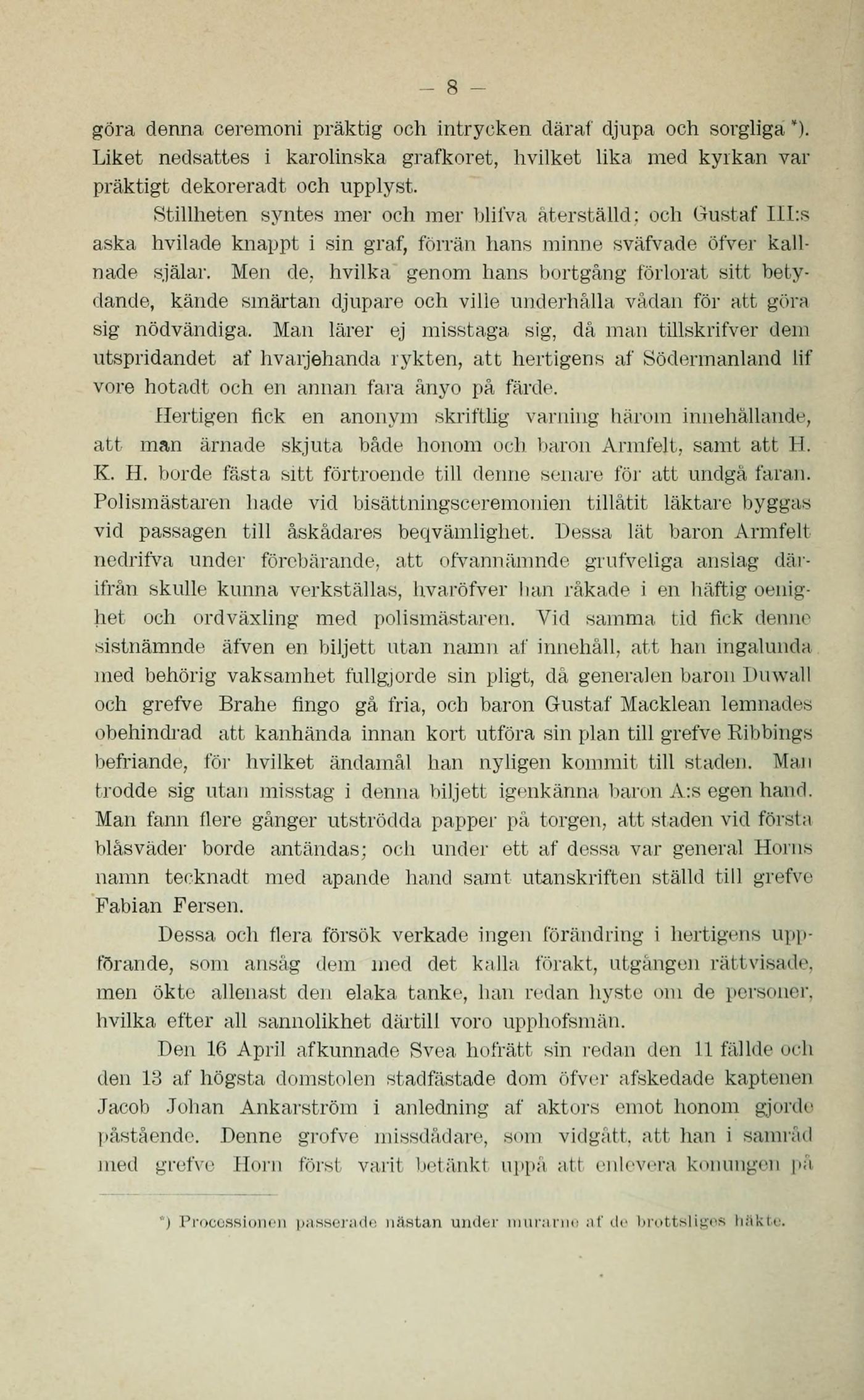 Hertigen fick en anonym skriftlig varning härom innehållande, att man ärnade skjuta både honom och baron Armfelt, samt att H. K. H. borde fästa sitt förtroende till denne senare för att undgå faran. Polismästaren hade vid bisättningsceremonien tillåtit läktare byggas vid passagen till åskådares beqvämlighet. Dessa lät baron Armfelt nedrifva under förebärande, att ofvannämnde grufveliga anslag därifrån skulle kunna verkställas, hvaröfver han råkade i en häftig oenighet och ordväxling med polismästaren. Vid samma tid fick denne sistnämnde äfven en biljett utan namn af innehåll, att han ingalunda med behörig vaksamhet fullgjorde sin pligt, då generalen baron Duwall och grefve Brahe fingo gå fria, och baron Gustaf Macklean lemnades obehindrad att kanhända innan kort utföra sin plan till grefve Ribbings befriande, för hvilket ändamål han nyligen kommit till staden. Man trodde sig utan misstag i denna biljett igenkänna baron A:s egen hand. Man fann flere gånger utströdda papper på torgen, att staden vid första blåsväder borde antändas; och under ett af dessa var general Horns namn tecknadt med apande hand samt utanskriften ställd till grefve Fabian Fersen.