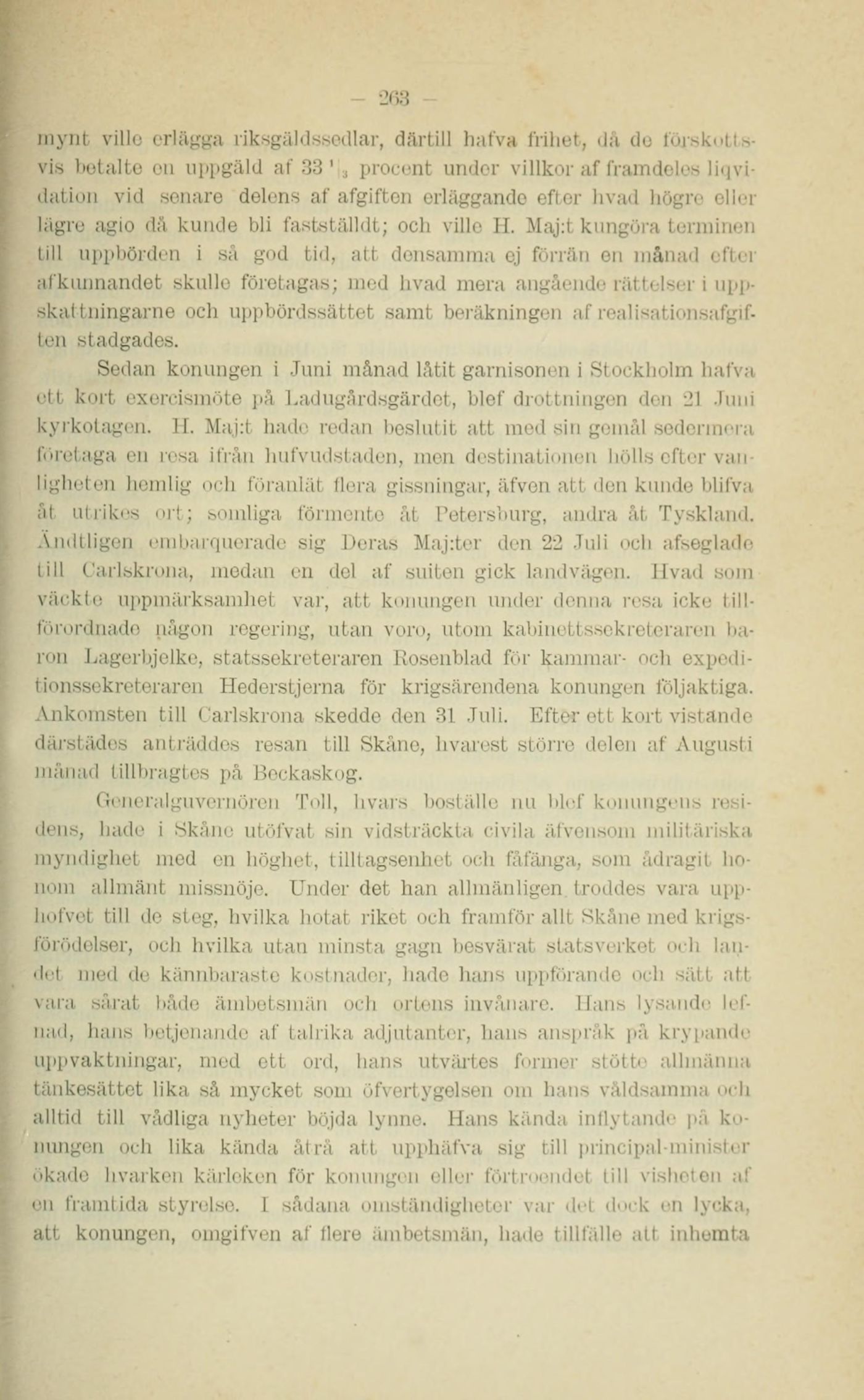 Generalguvernören Toll, hvars boställe nu blef konungens residens, hade i Skåne utöfvat sin vidsträckta civila äfvensom militäriska myndighet med en höghet, tilltagsenhet och fåfänga, som ådragit honom allmänt missnöje. Under det han allmänligen troddes vara upphofvet till de steg, hvilka hotat riket och framför allt Skåne med krigsförödelser, och hvilka utan minsta gagn besvärat statsverket och landet med de kännbaraste kostnader, hade hans uppförande och sätt att vara sårat både ämbetsmän och ortens invånare. Hans lysande lefnad, hans betjenande af talrika adjutanter, hans anspråk på krypande uppvaktningar, med ett ord, hans utvärtes former stötte allmänna tänkesättet lika så mycket som öfvertygelsen om hans våldsamma och alltid till vådliga nyheter böjda lynne. Hans kända inflytande på konungen och lika kända åtrå att upphäfva sig till principal-minister ökade hvarken kärleken för konungen eller förtroendet till visheten af en framtida styrelse. I sådana omständigheter var det dock en lycka, att konungen, omgifven af flere ämbetsmän, hade tillfälle att inhemta