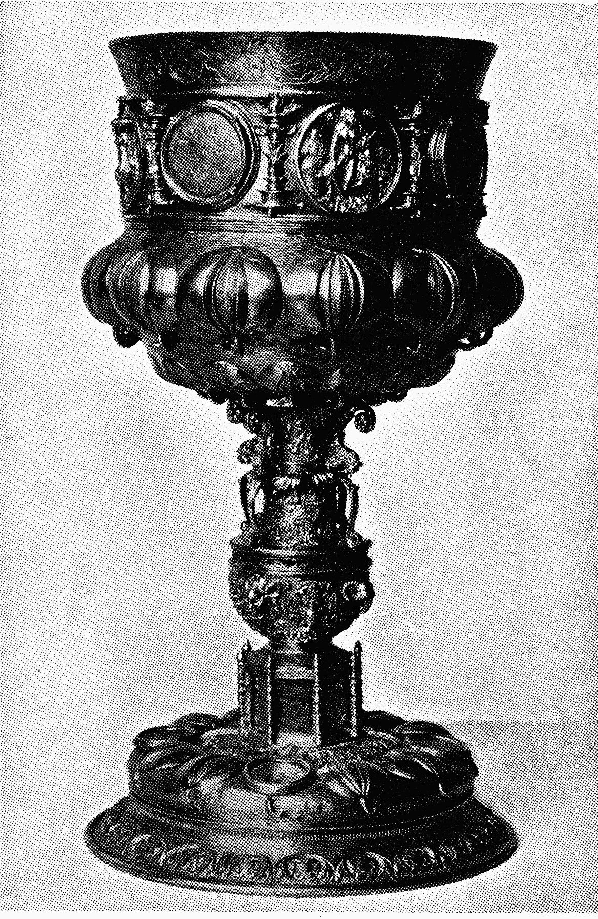 Fig. 1. Kalk af förgylldt silfver; Sydtyskland, omkring år 1600. Tillhör Jäders församling. Höjd 0,3 m. |