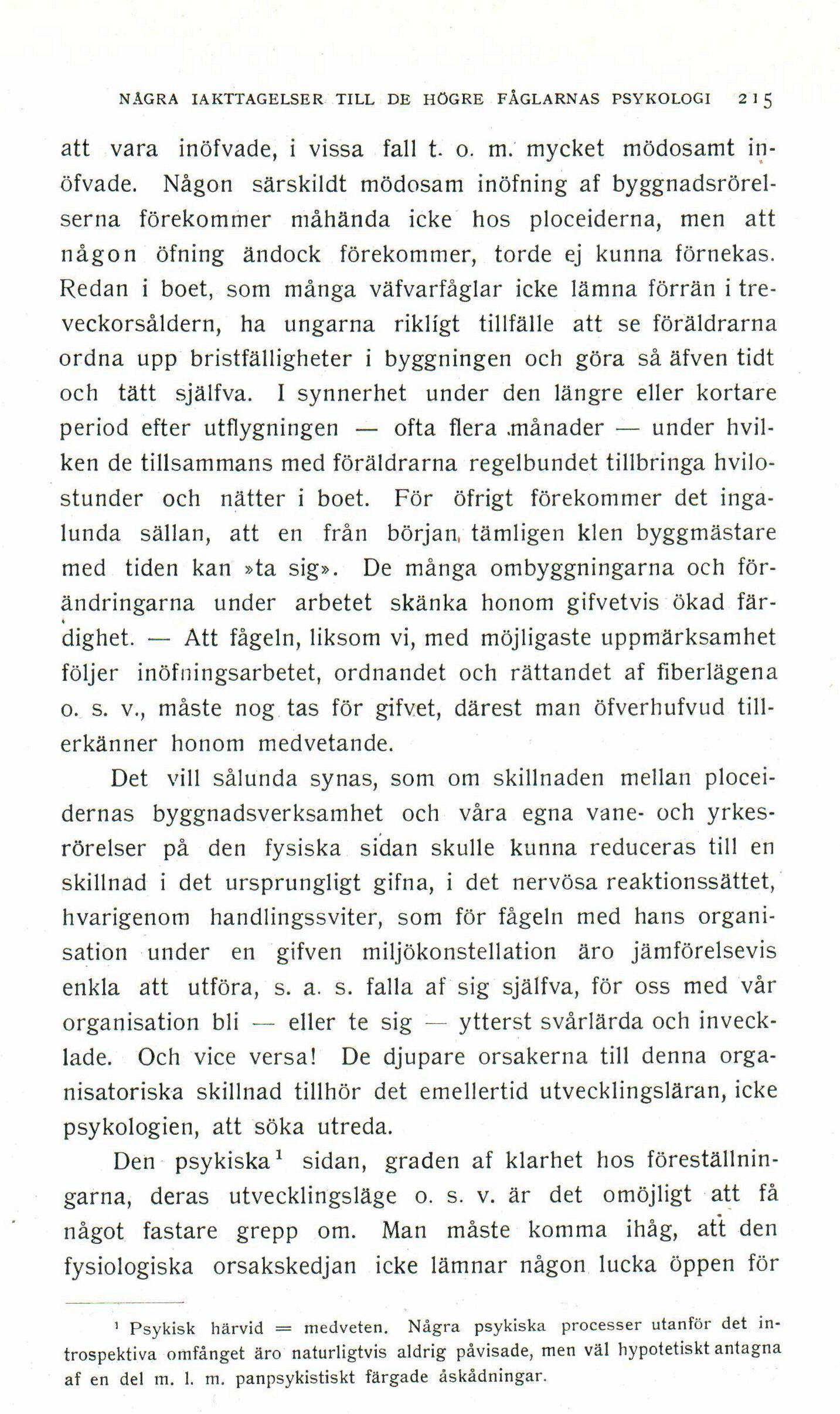 NÅGRA IAKTTAGELSER TILL DE HÖGRE FÅGLARNAS PSYKOLOGI 2 1 5