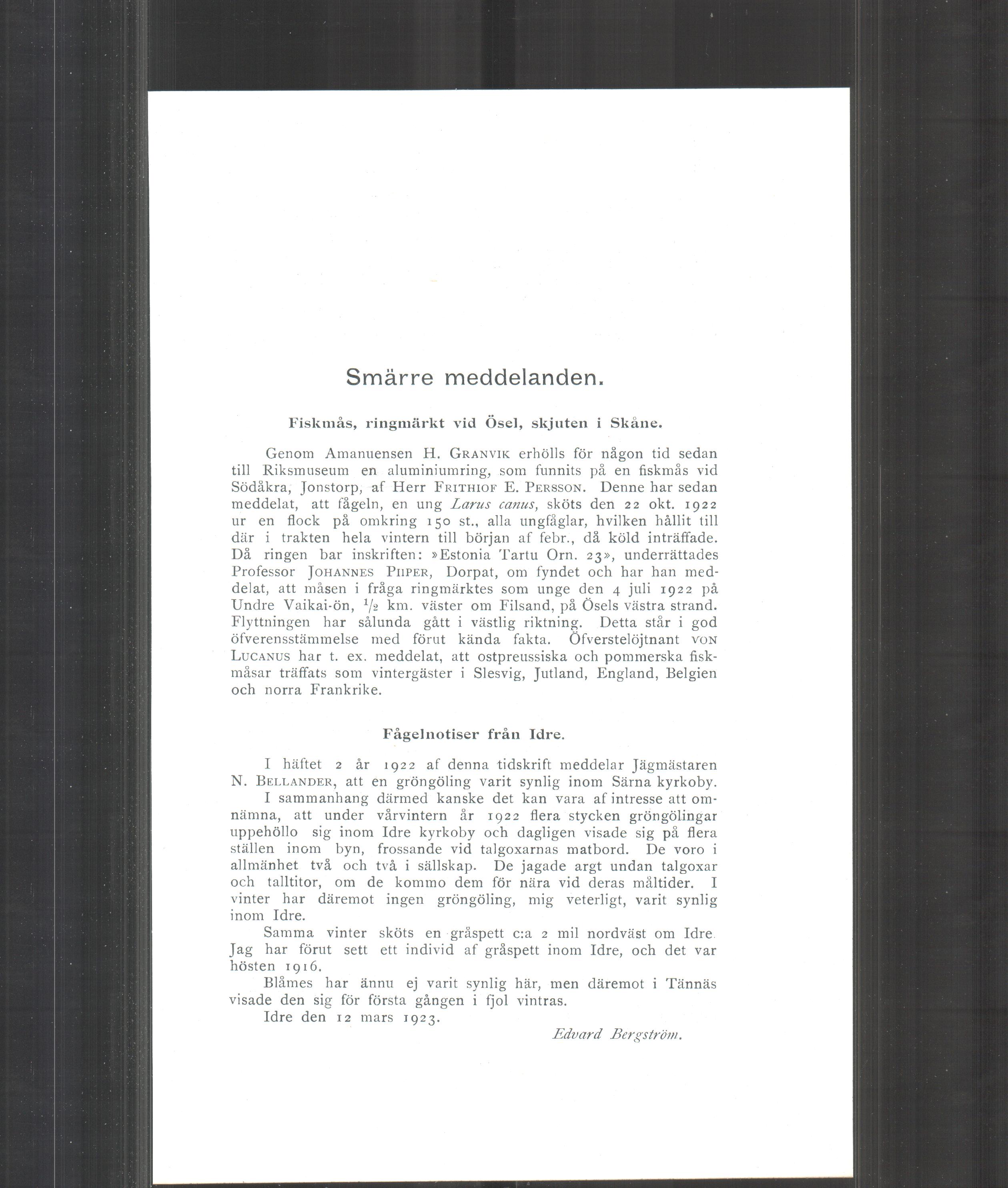 meddelat, att fågeln, en ung Larus canus, sköts den 22 okt. 1922