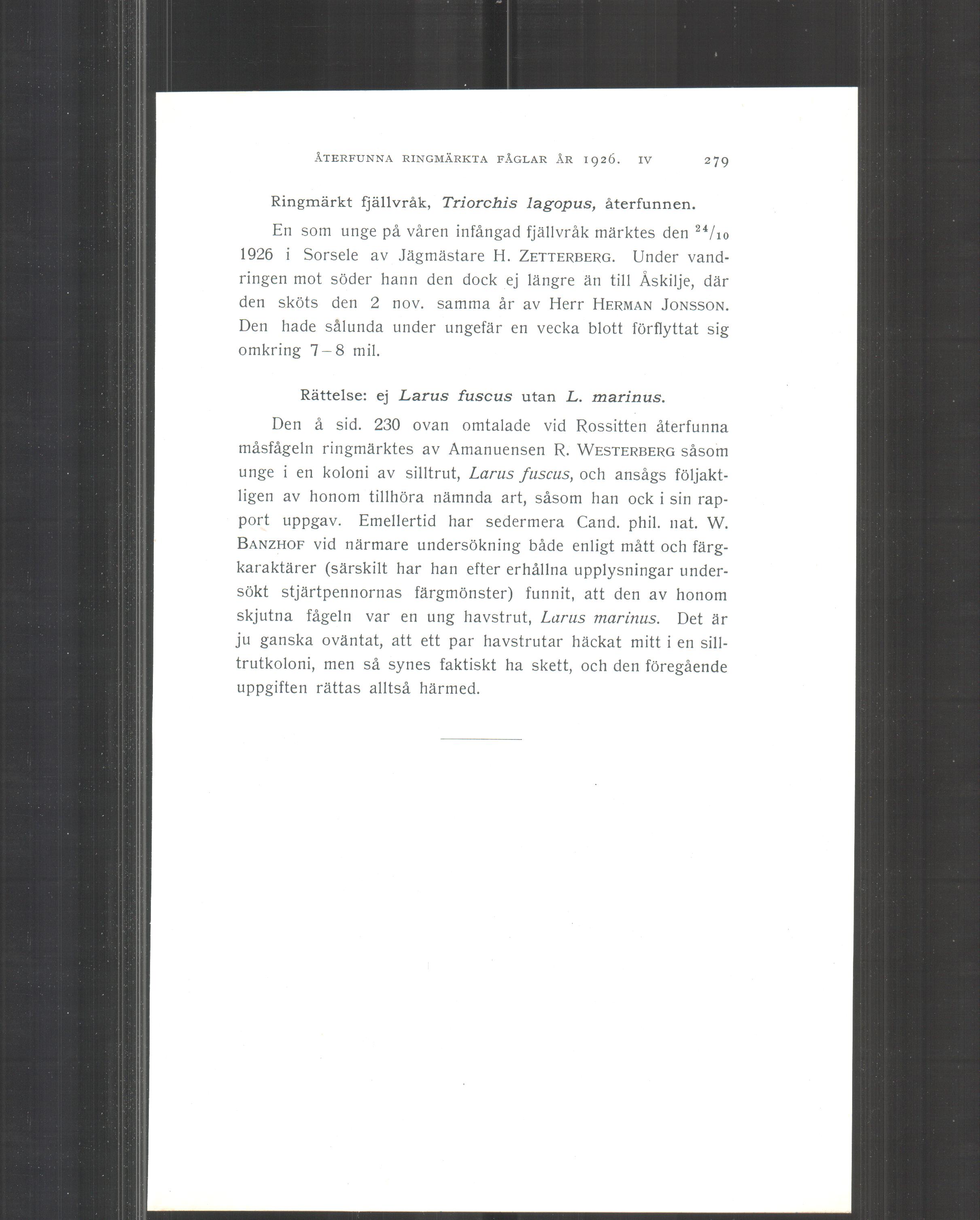 ÅTERFUNNA RINGMÄRKTA FÅGLAR ÅRI926. IV 279