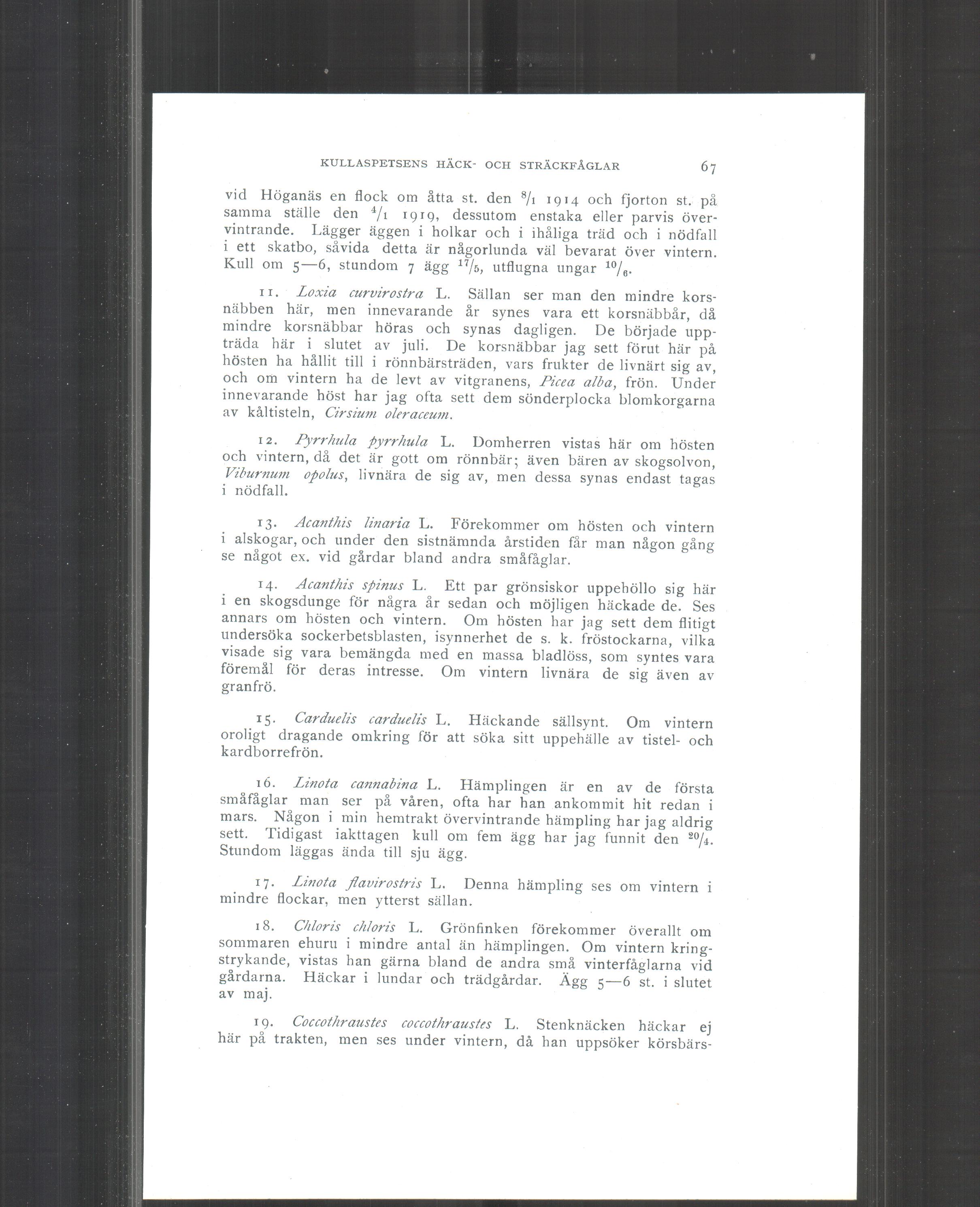 13. Acanthis linaria L. Förekommer om hösten och vintern