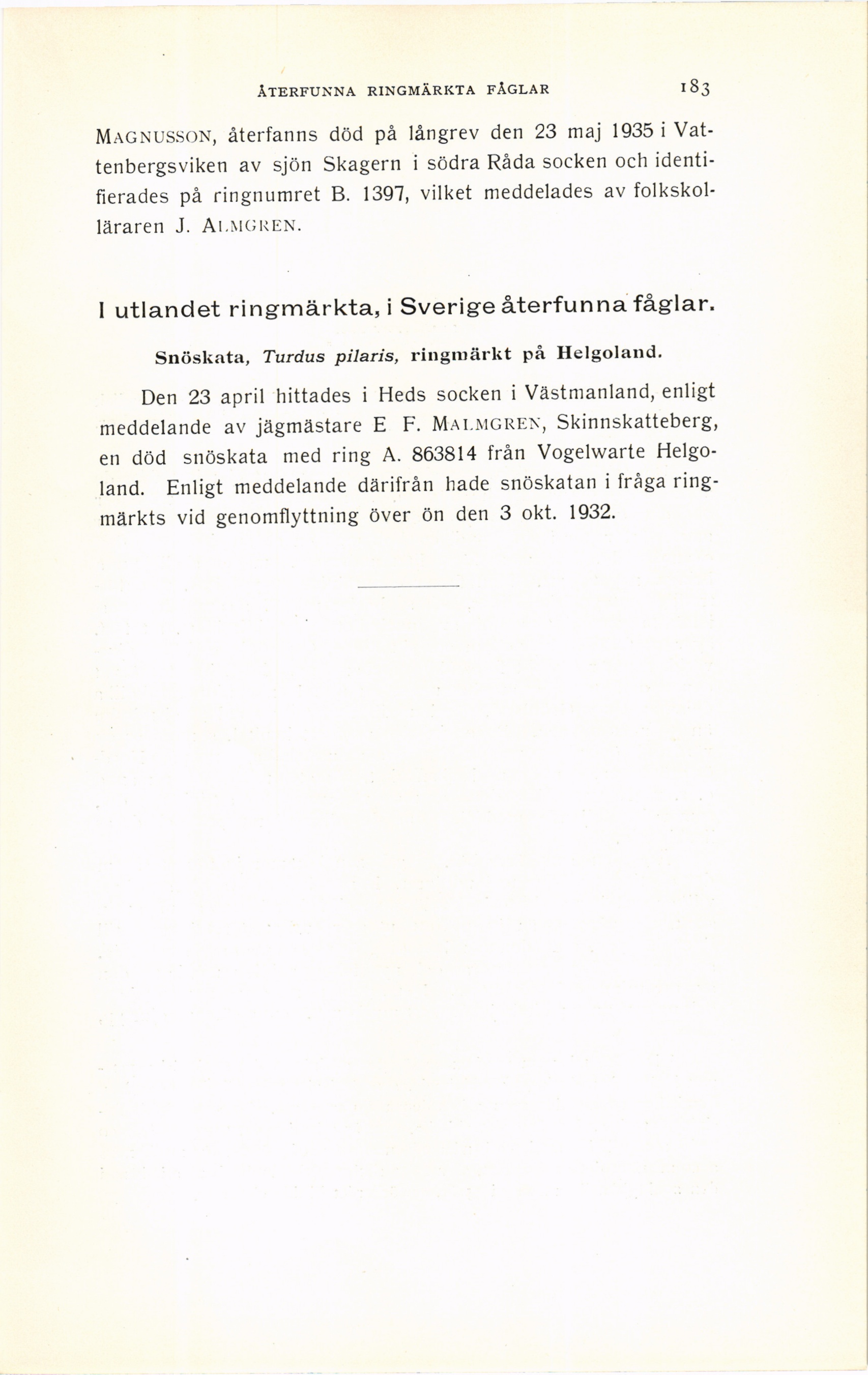 återfunna ringmärkta fåglar 183