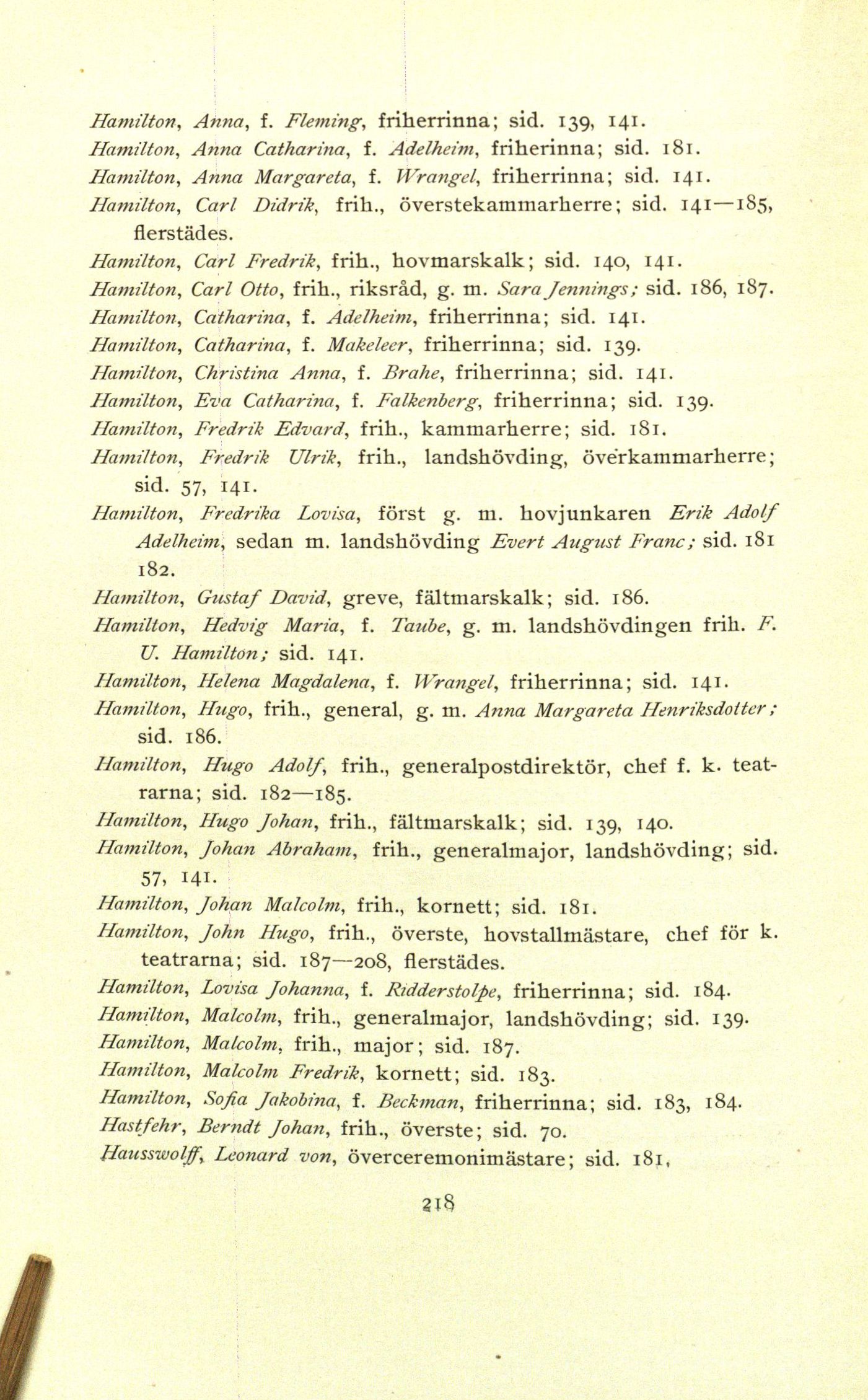 Hamilton, Anna, f. Fleming, friherrinna; sid. 139, 141.