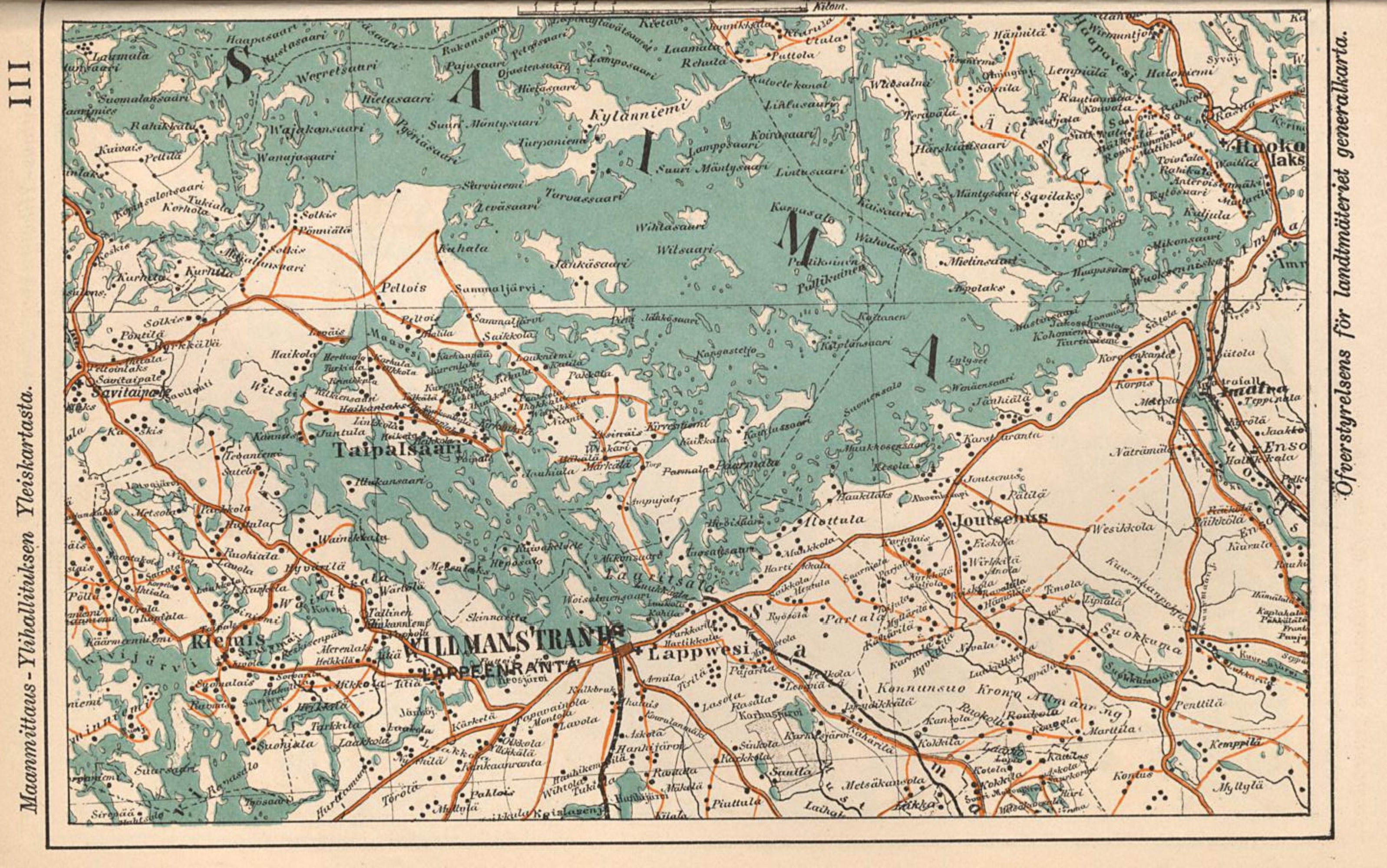 | III. Maanmittaus - Ylihallituksen Yleiskartasta / Öfverstyrelsens för landtmäteriet generalkarta. [Willmanstrand / Lappeenranta] |