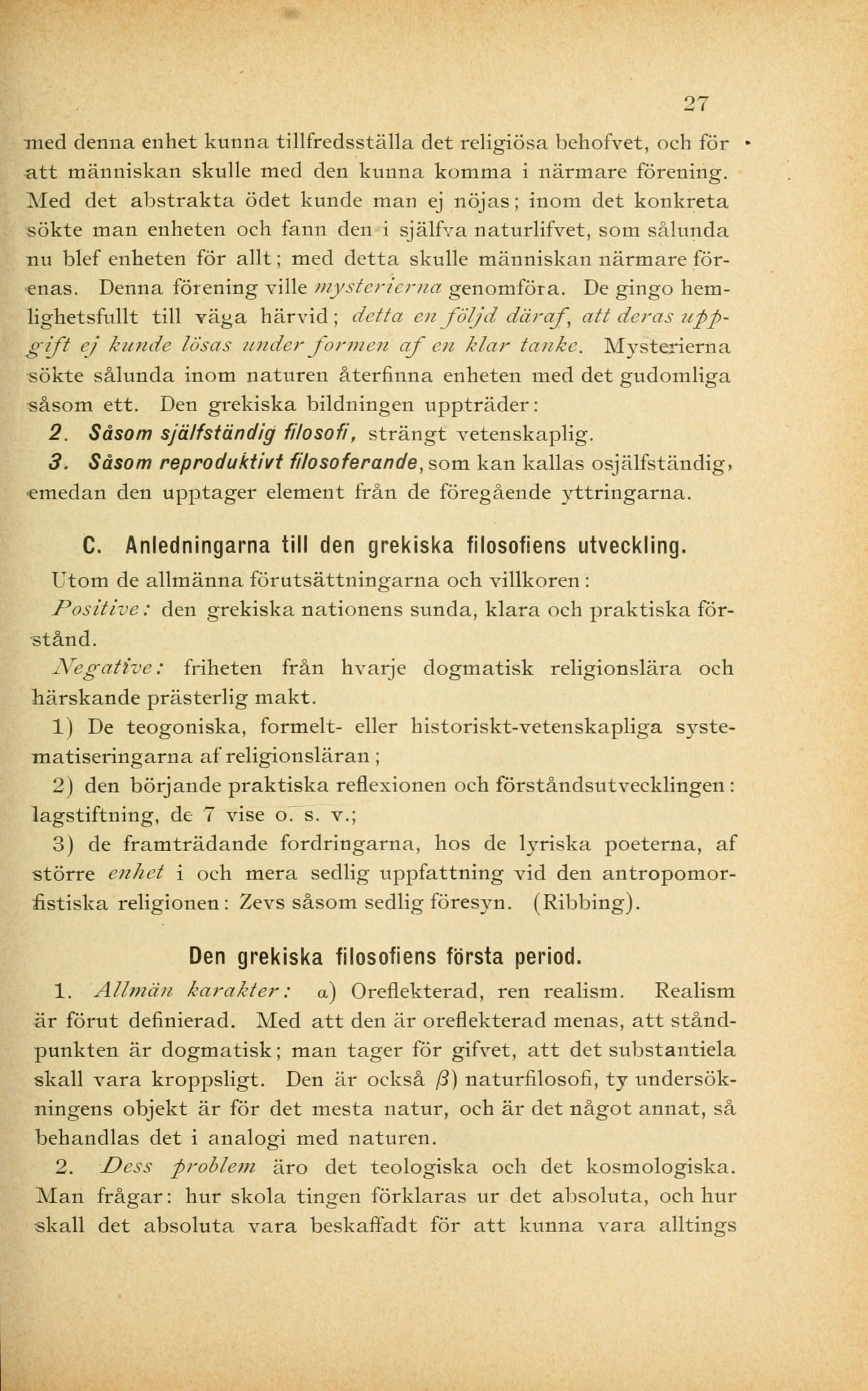 C. Anledningarna till den grekiska filosofiens utveckling.