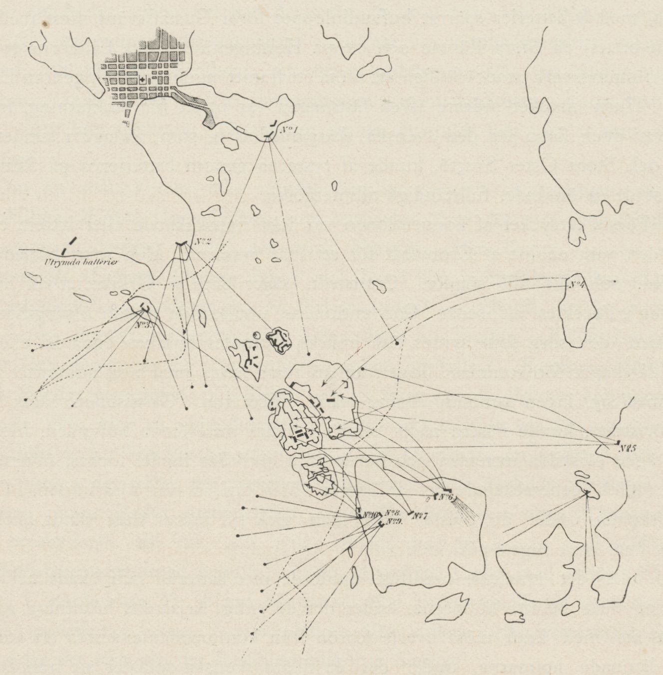 Ryssarnas batterier kring Sveaborg vid belägringens slut. |