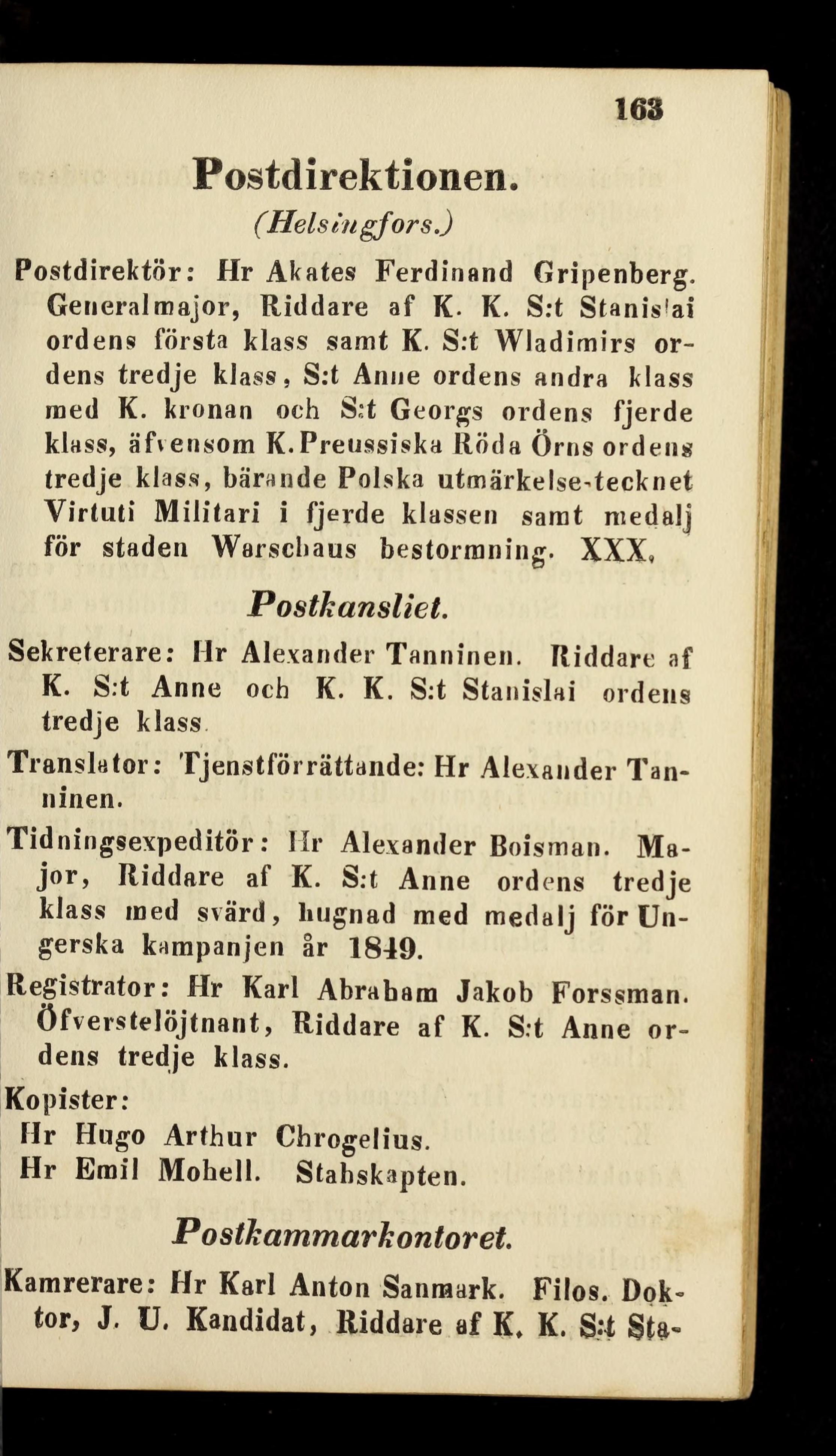 Postdirektör : Hr Akates Ferdinand Gripenberg.