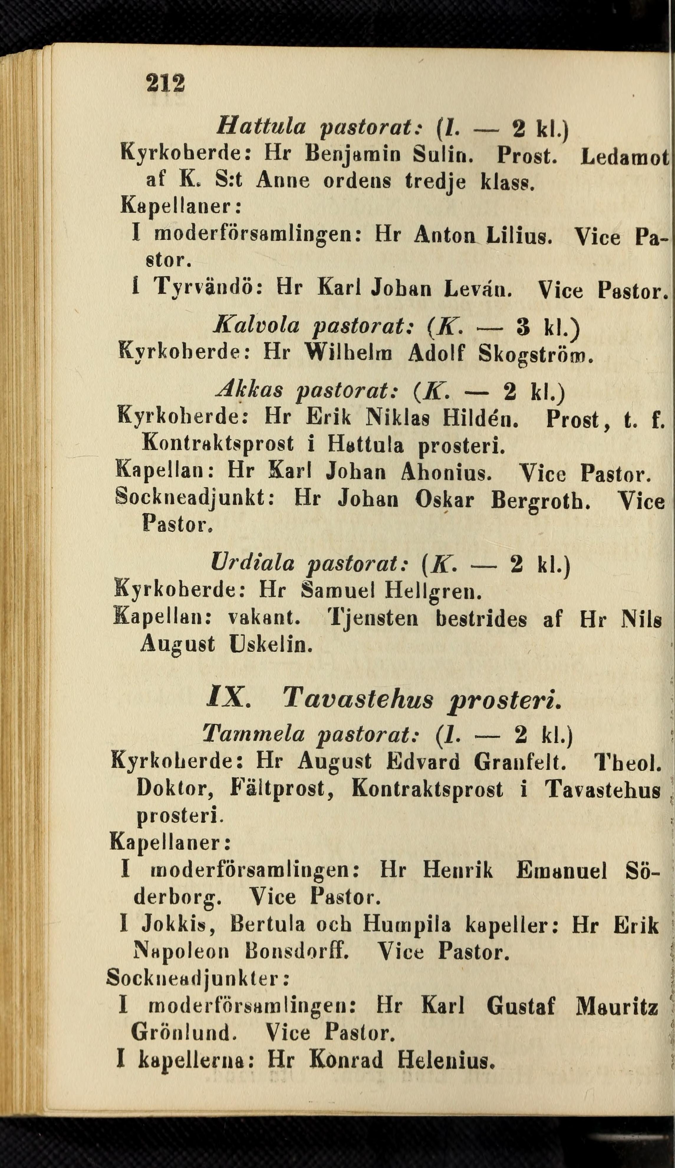Kapellan: Hr Karl Johan Ahonius. Vice Pastor.