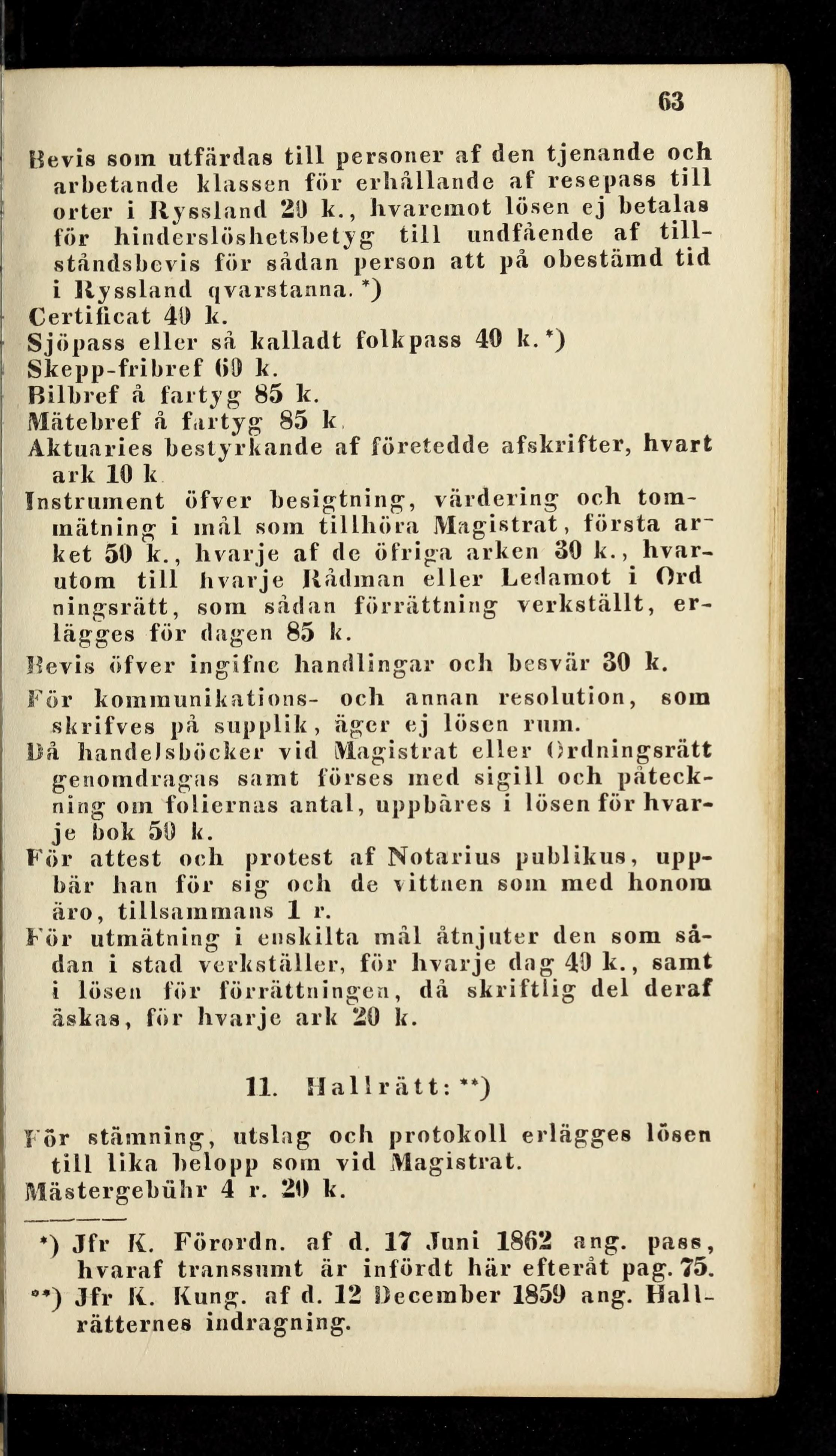 **) Jfr K. Kung. af d. 12 Becember 1859 ang. Hall-