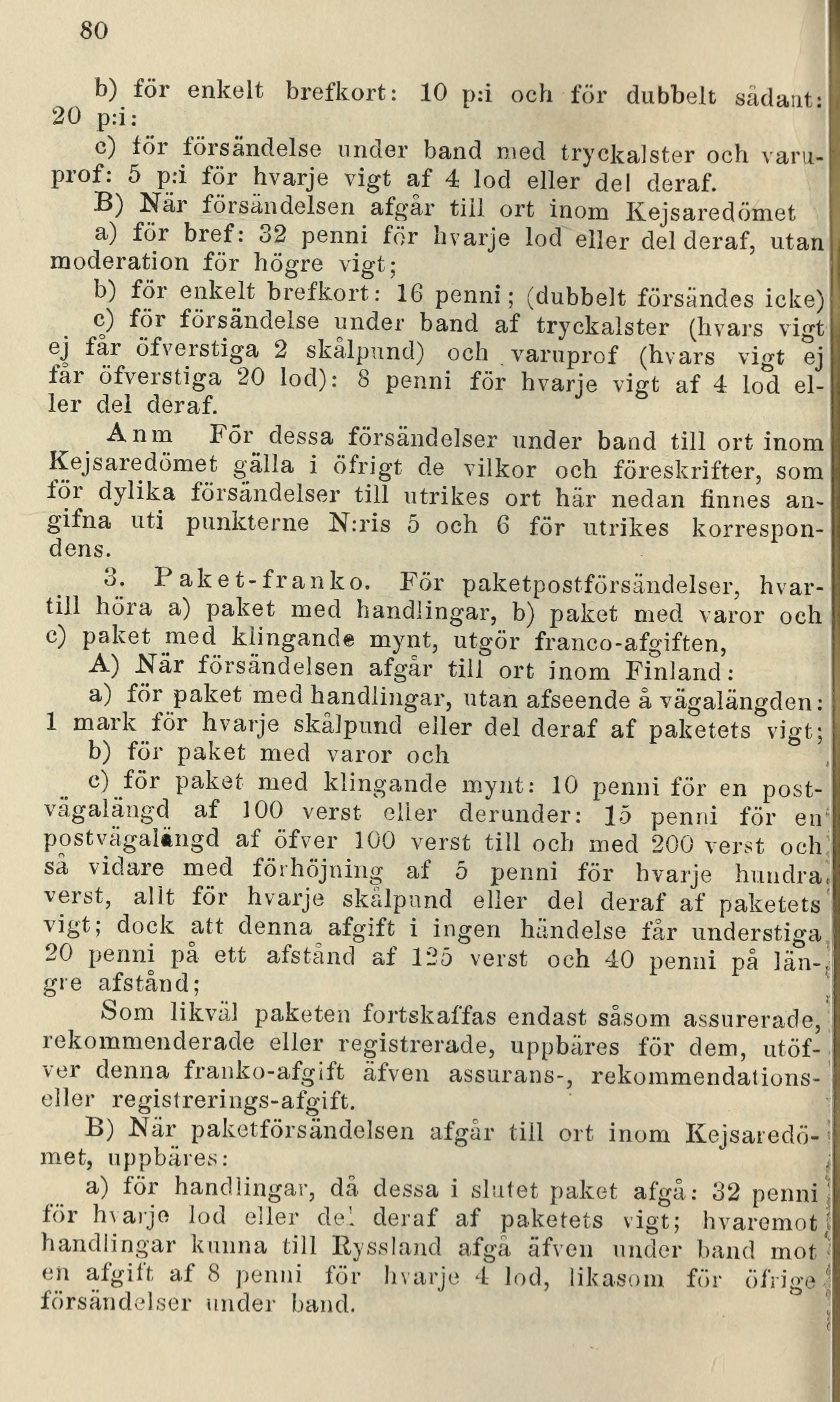 b) för enkelt brefkort: 16 penni; (dubbelt försändes icke)