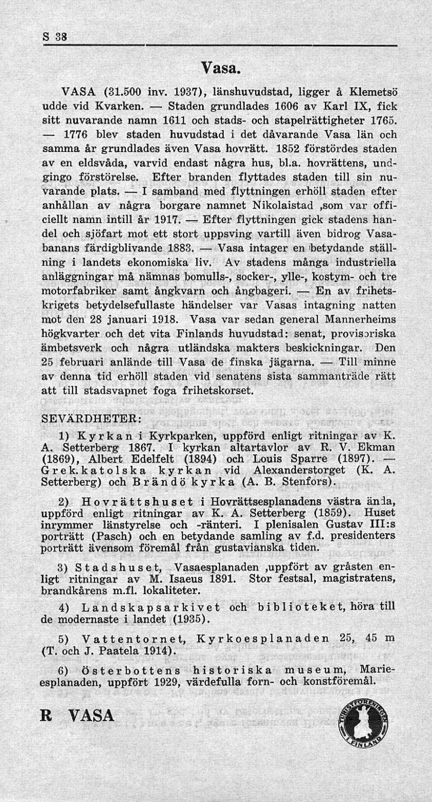 VASA (31.500 inv. 1937), länshuvudstad, ligger å Klemetsö
