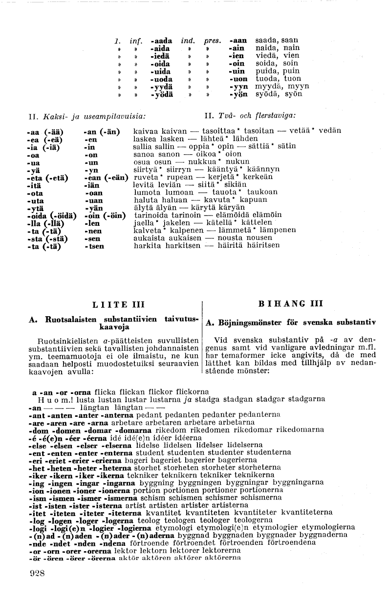 Full resolution (TIFF) - On this page / på denna sida - Liite II. Taivutuskaavoja. Bihang II. Finska böjningsmönster - Liite III. Taivutuskaavoja. Bihang II. Svenska böjningsmönster