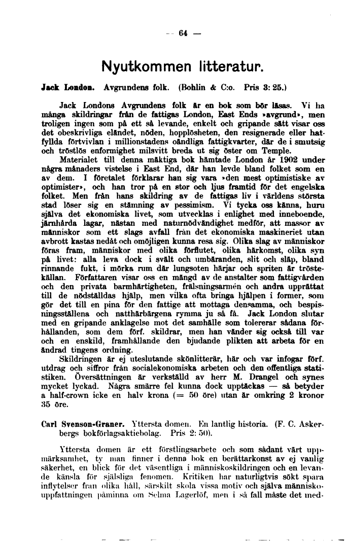 Jack London. Avgrundens folk. (Bohlin & C:o. Pris 3: 25.)