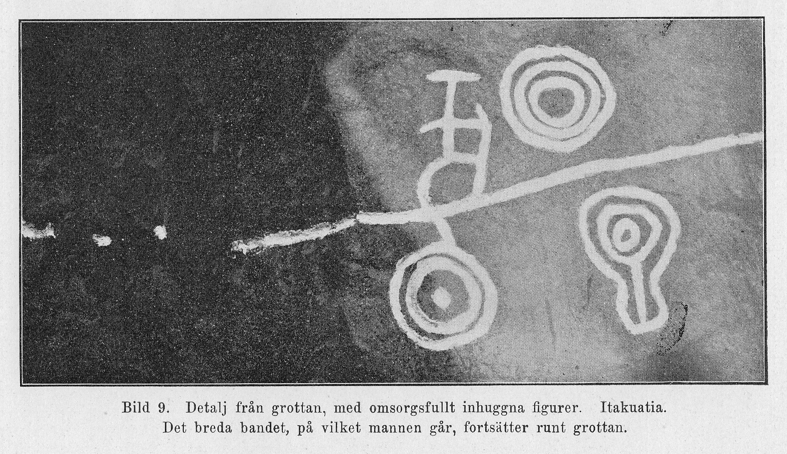 Bild 9. Detalj från grottan, med omsorgsfullt inhuggna figurer. Itakuatia. Det breda bandet, på vilket mannen går, fortsätter runt grottan. |