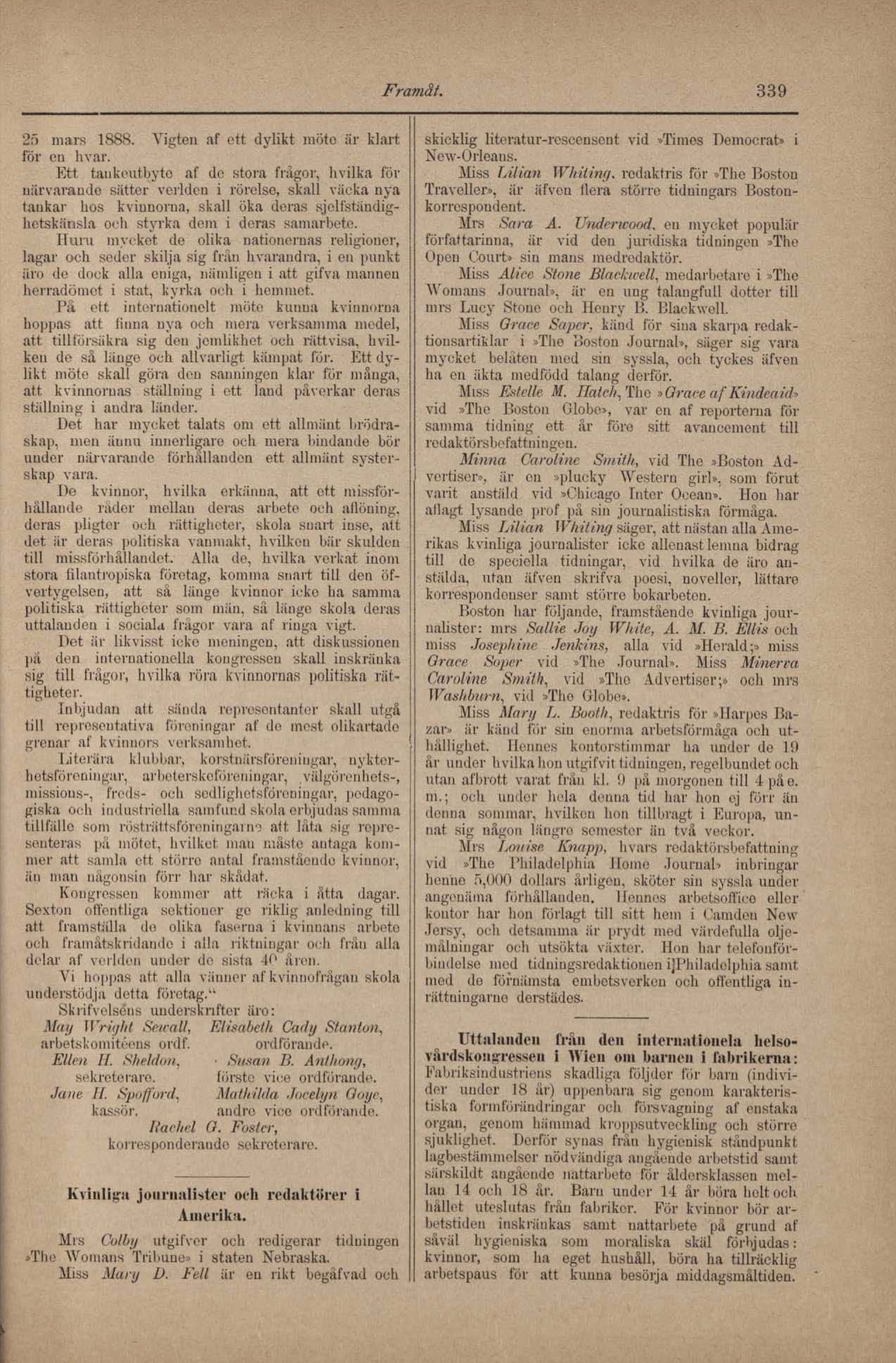 The Womans Tribune» i staten Nebraska.
