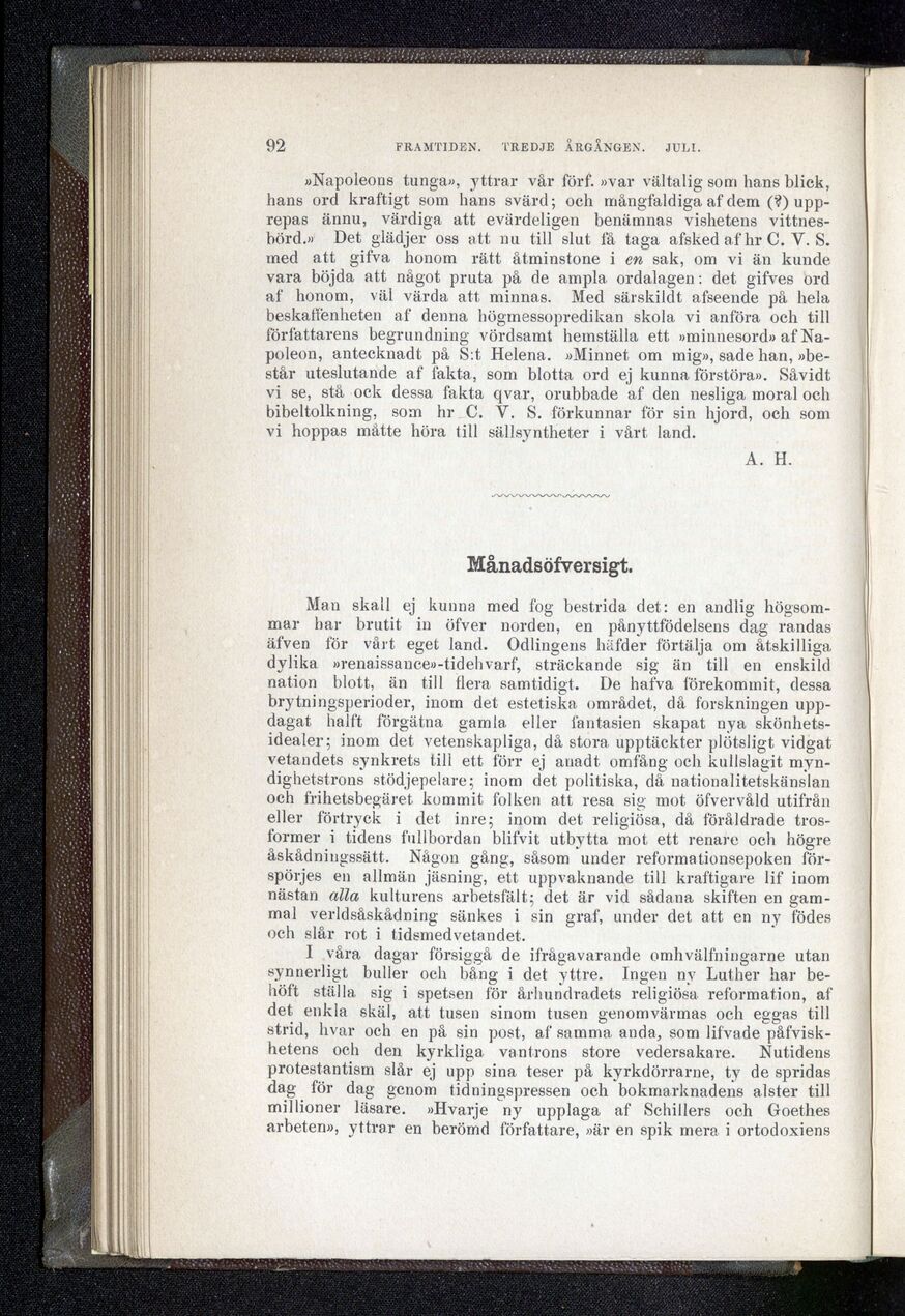 - Spår af Napoleons-kult inom svenska statskyrkan (Luther och Napoleon. Tvenne högmessopedikningar hållne år 1809 af C. V. S.). Af A. H.