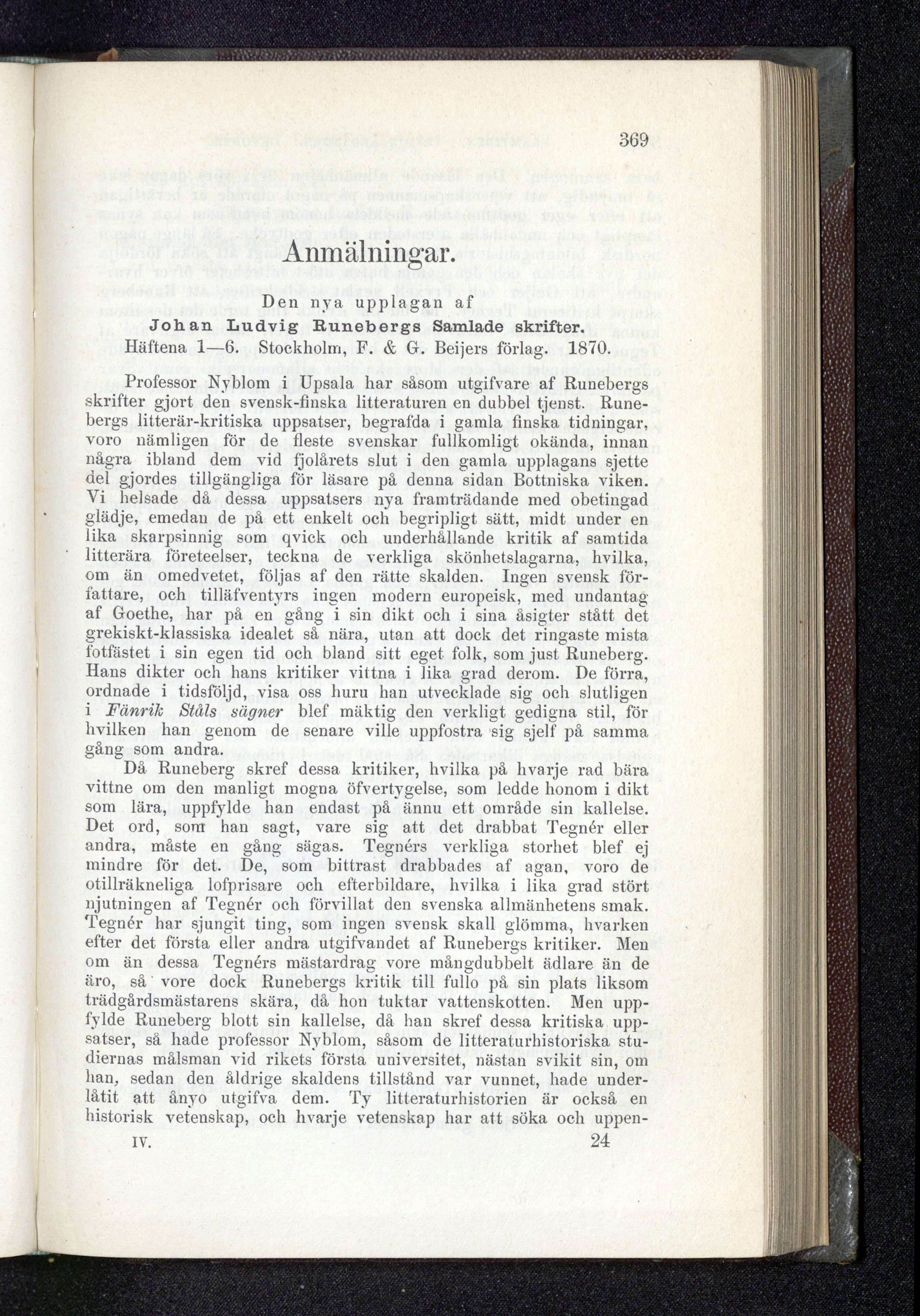 Full resolution (JPEG) - On this page / på denna sida - Tionde häftet, Oktober - Anmälningar - Den nya upplagan af Johan Ludvig Runebergs Samlade skrifter. Af P. A. G.