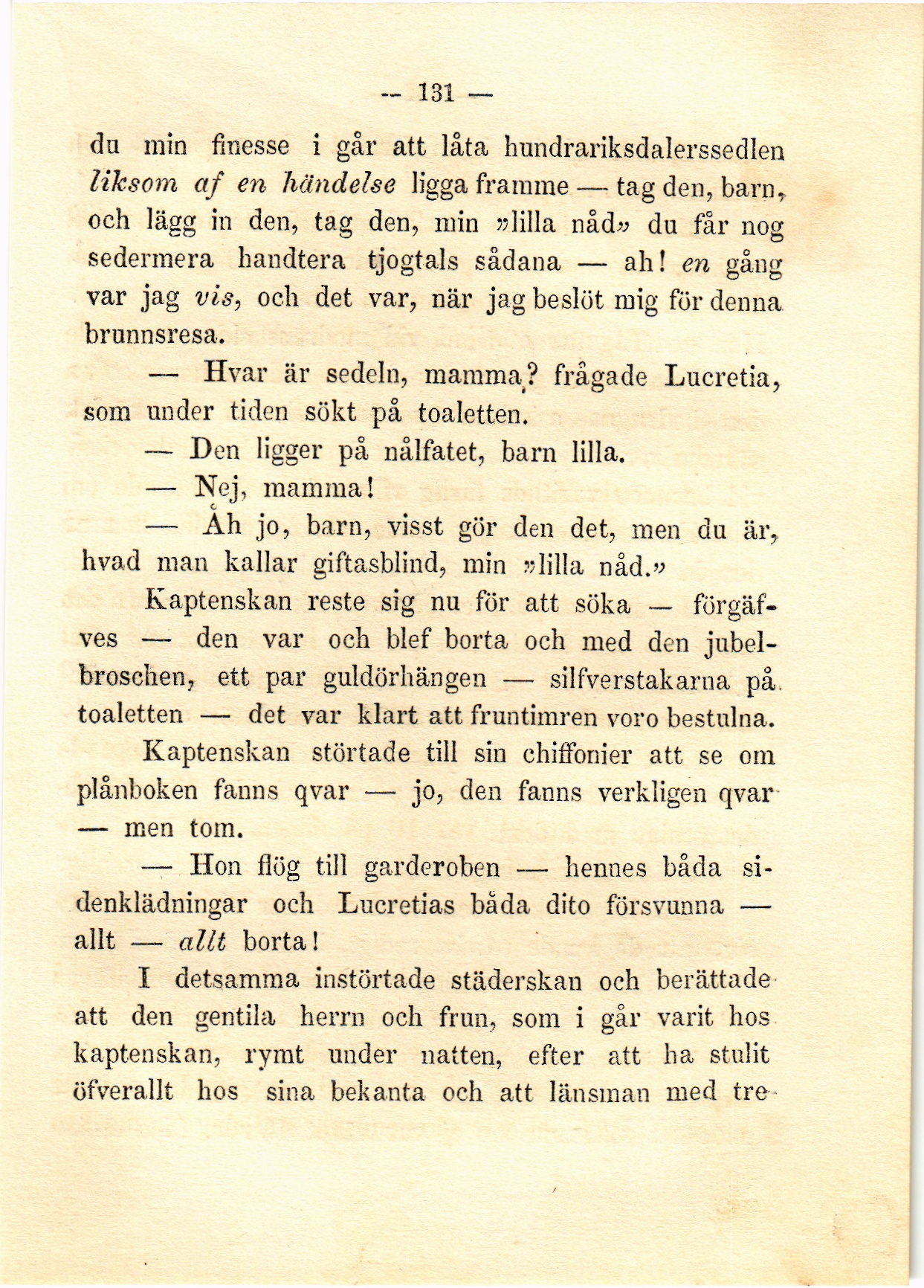 — Hvar är sedeln, mamma? frågade Lucretia,