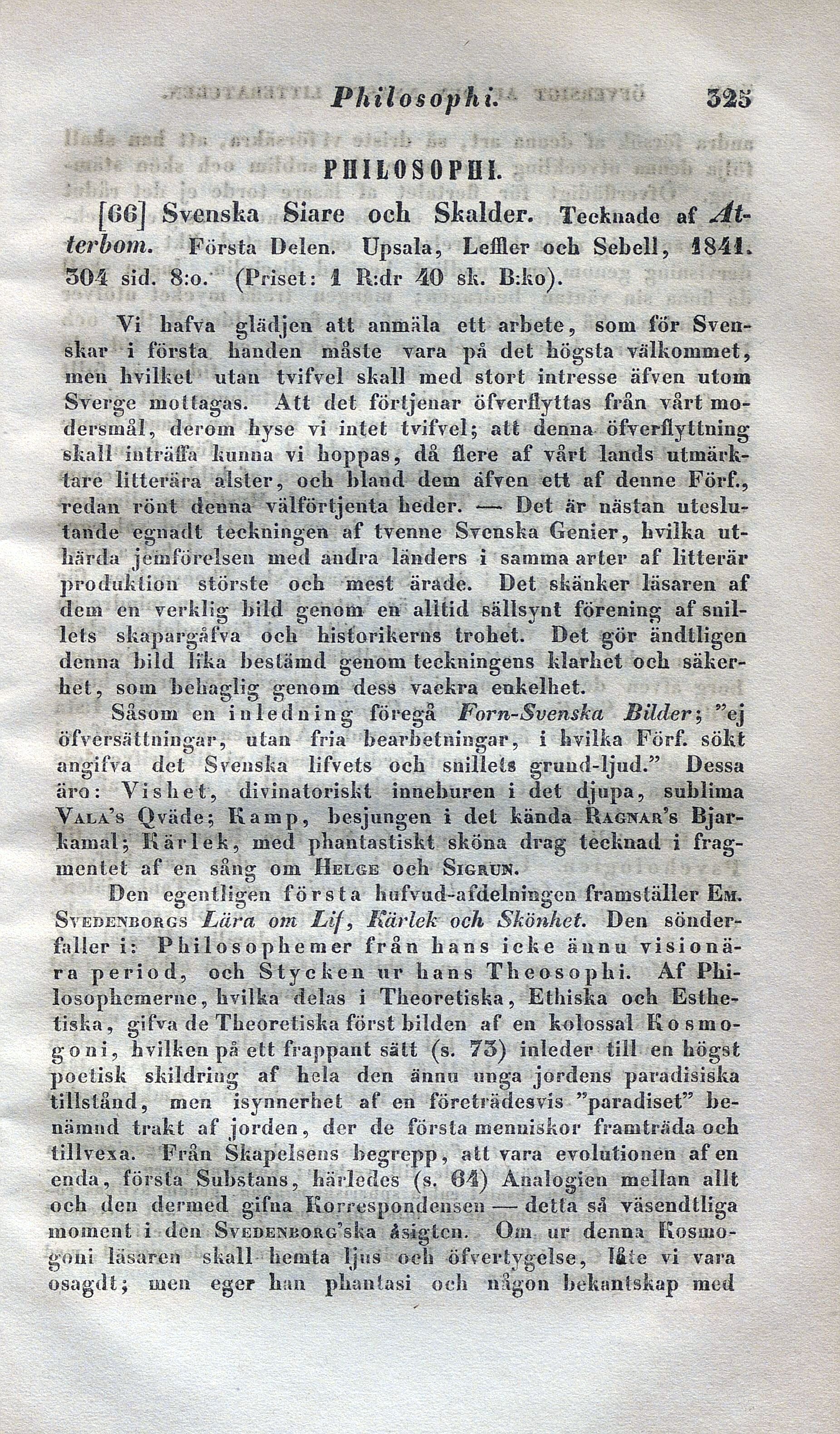 Full resolution (JPEG) - On this page / på denna sida - Häfte III - Öfversigt af den nyaste Litteraturen - Philosophi - [66] Atterbom, Svenska Siare och Skalder