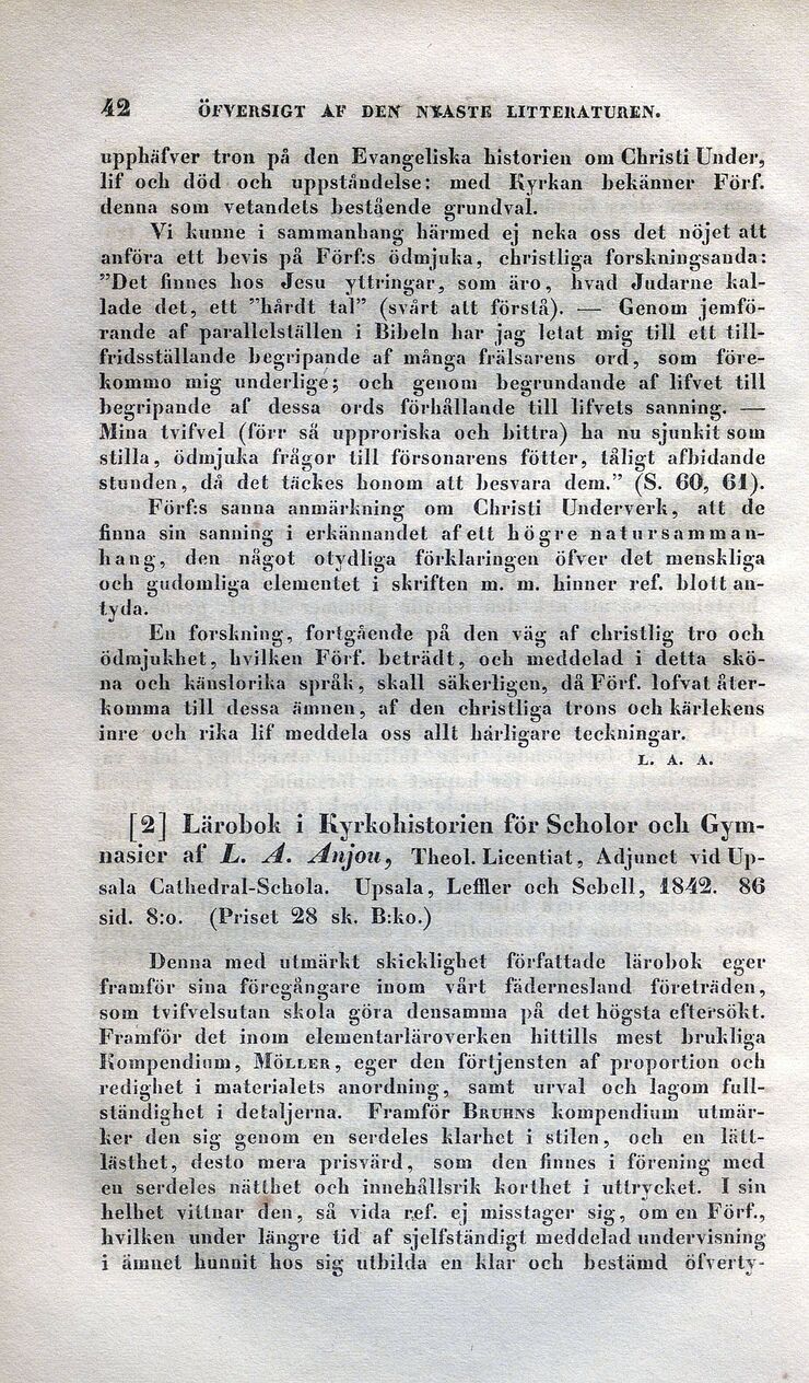 Full resolution (JPEG) - On this page / på denna sida - Häfte I - Öfversigt af den nyaste Litteraturen - [1] Strauss-litteratur inom Sverige (Forts. fr. 1841); 7. Franzén, Det står dock qvar det gamla Ordet; 8. Ullmann, Tvenne Skrifter, jemte företal af Fahlcrantz; 9. Bremer, Morgon-Väckter - [2] Anjou, Lärobok i Kyrkohistorien