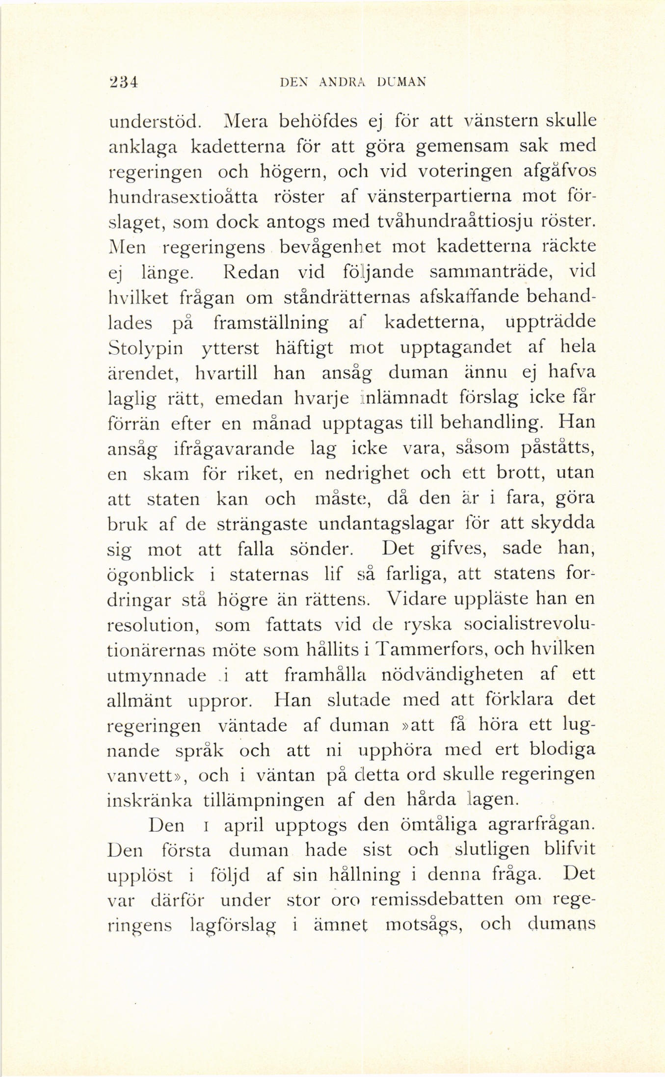 Stolypin ytterst häftigt mot upptagandet af hela