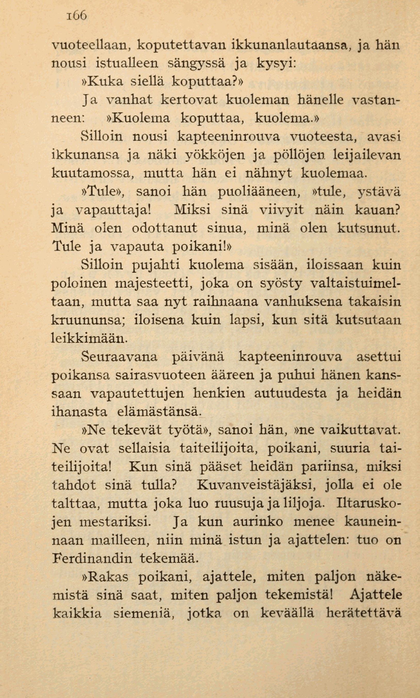 vastanneen: — »Kuolema koputtaa, kuolema.»