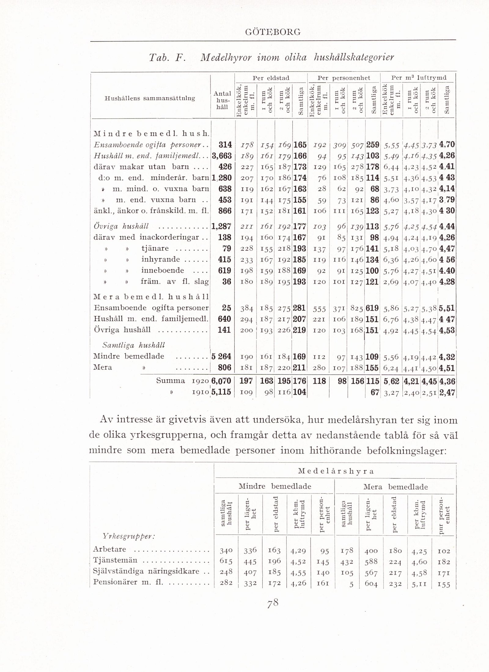 Tab. F. Medelhyror inom olika hushålhkategorier
