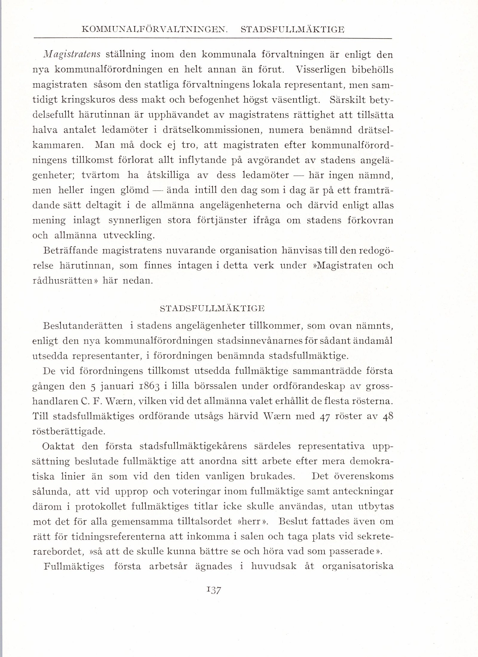Till stadsfullmäktiges ordförande utsågs härvid Wærn med 47 röster av 48