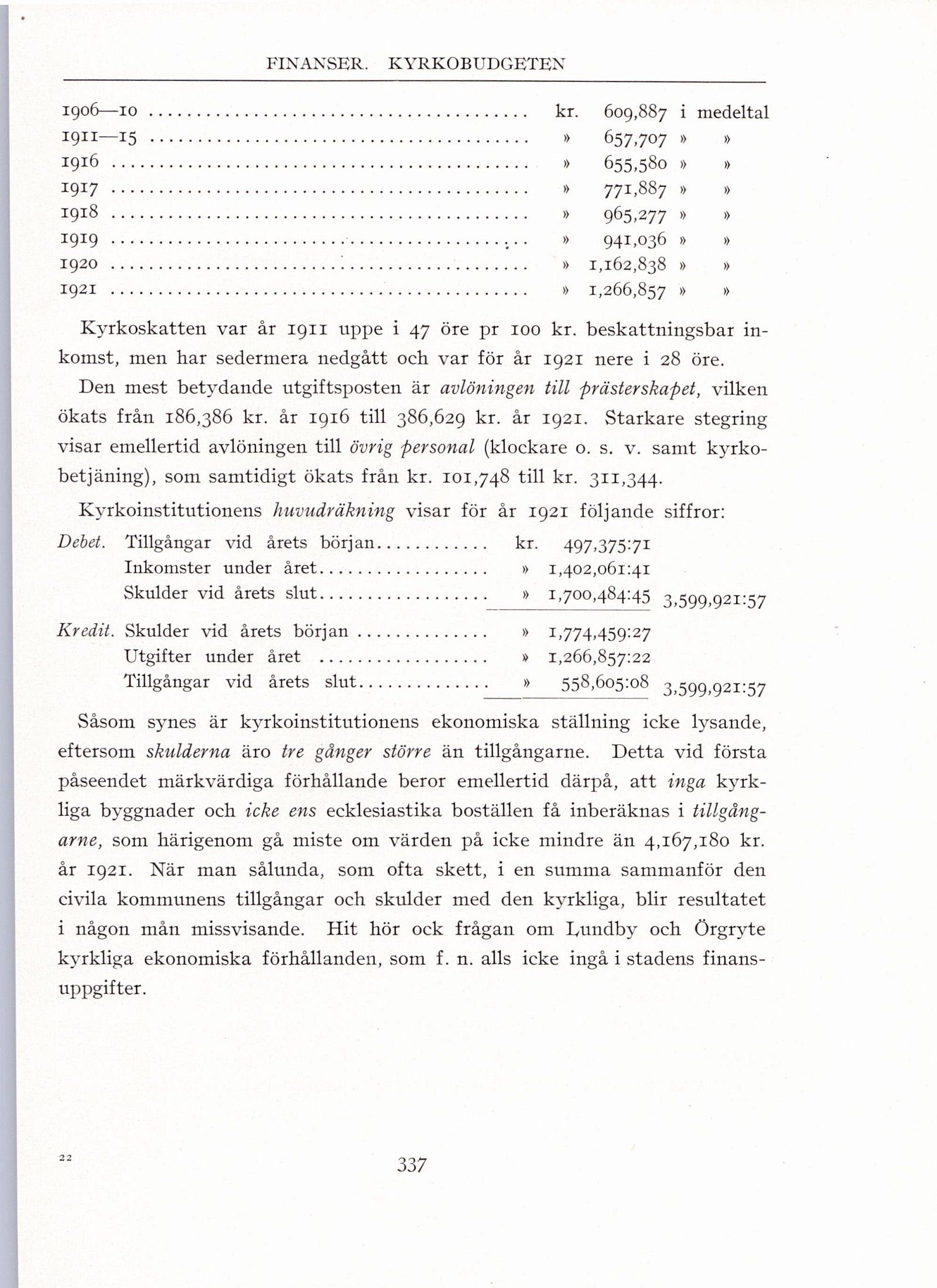 Kyrkoinstitutionens huvudräkning visar för år 1921 följande siffror: