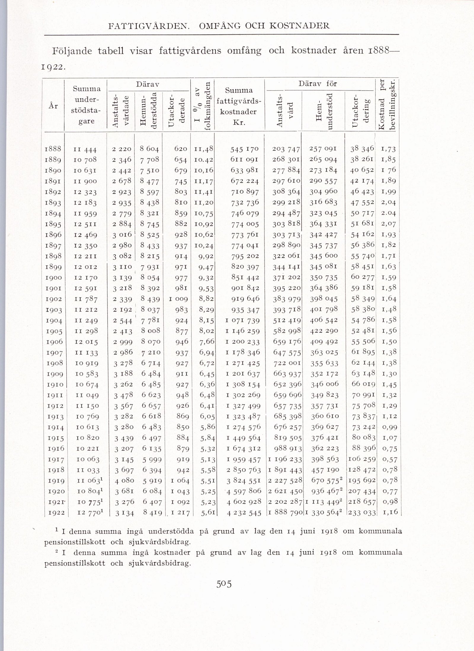 Följande tabell visar fattigvårdens omfång och kostnader åren 1888—
