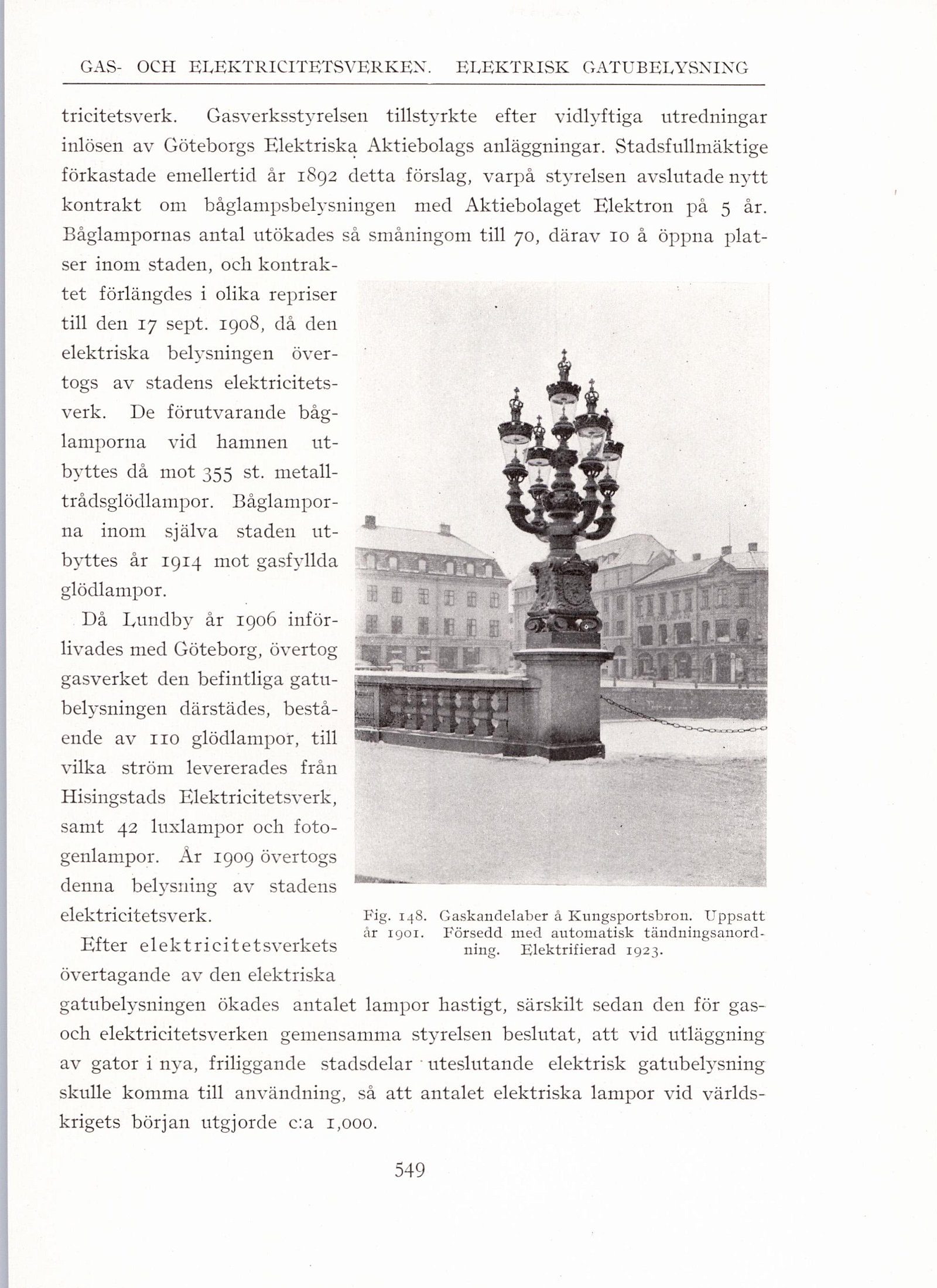 Fig. 148. Gaskandelaber å Kungsportsbron. Uppsatt år 1901. Försedd med automatisk tändningsanordning. Elektrifierad 1923. |