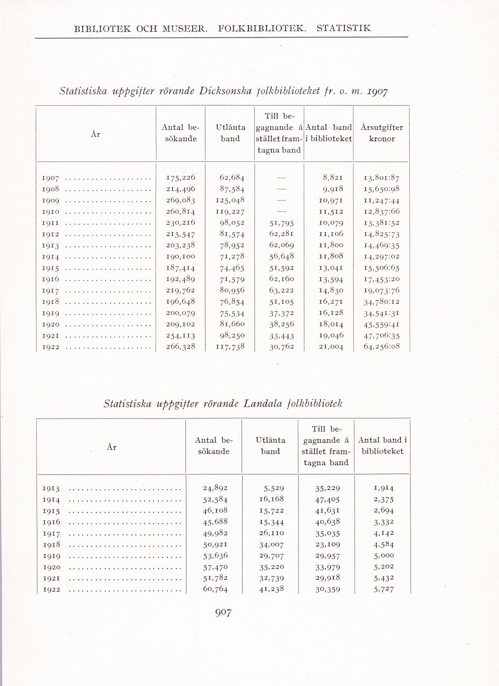 Statistiska uppgifter rörande Dicksonska folkbiblioteket fr. o. m. igoy