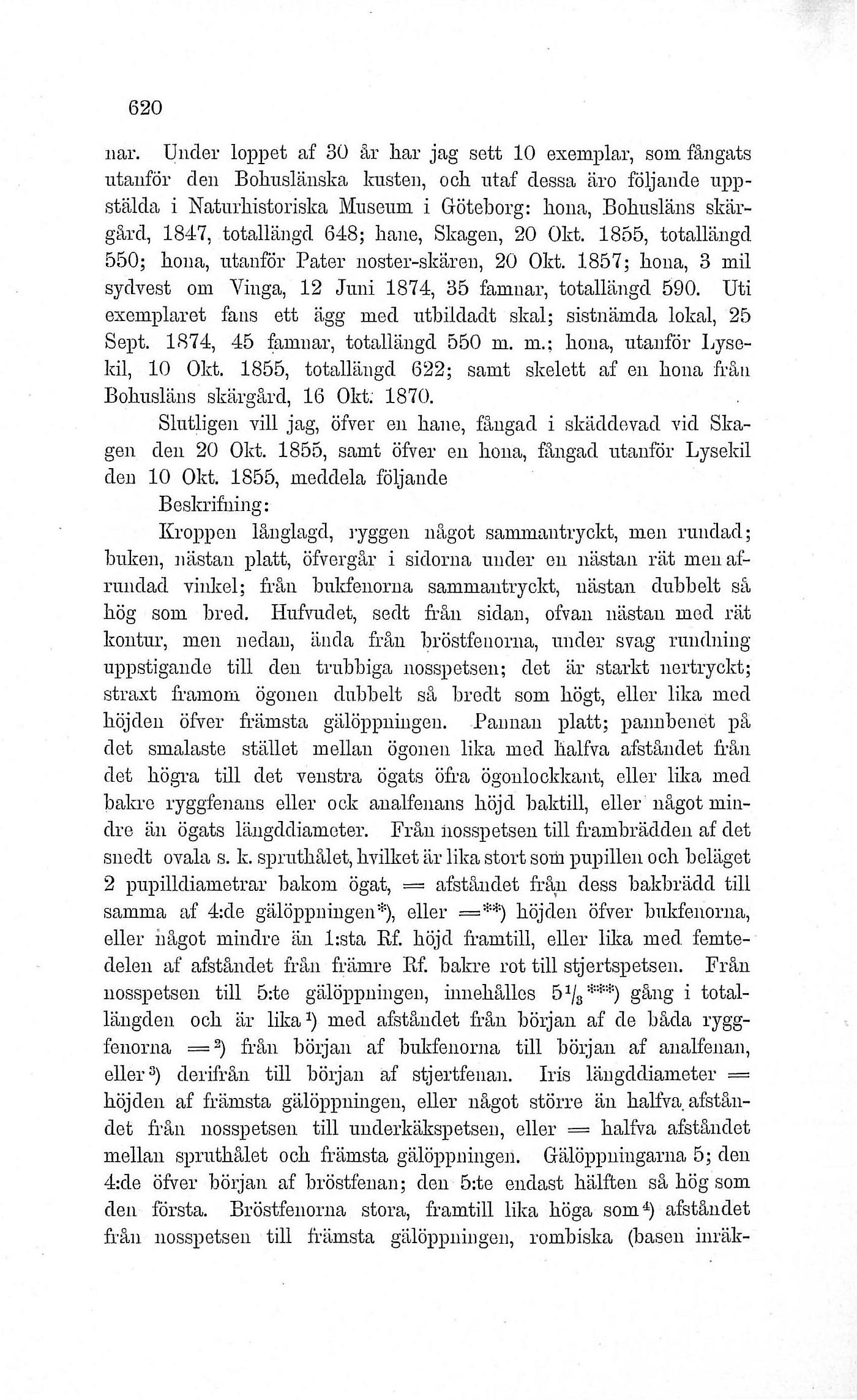 skärgård, 1847, totallängd 648; hane, Skagen, 20 Okt. 1855, totallängd