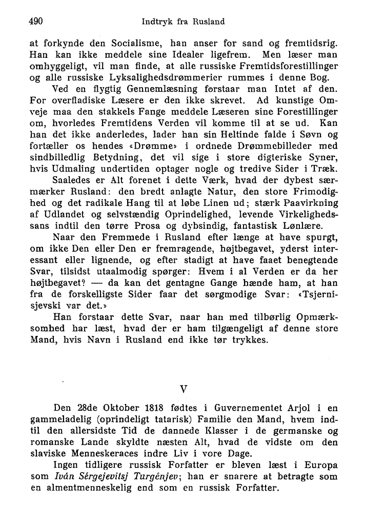 Full resolution (TIFF) - On this page / på denna sida - Indtryk fra Rusland - Literære Indtryk - IV. Den nationale Ejendommelighed. Lillerusserne Gogol og Sjevtsjenko. Gogols Satire og Genialitet. Hans Undergang. — Sjevtsjenkos Lidelseshistorie og Poesi. — Reformatorerne Herzen og Tsjernisjevski. Herzen og Bjelinski. Herzen skaber en offenlig Mening. Tsjernisjevskis Fængsling og Dom. Hans Skæbne og Ideer. Det typisk Russiske i hans Hovedværk - V. Turgenjev, den første russiske Forfatter, som bliver international. Hans Sortsyn. Han er Kunstner og Tænker. Hans Virksomhed for Livegenskabets Ophævelse. Karakteristik af ham selv og hans Romaner