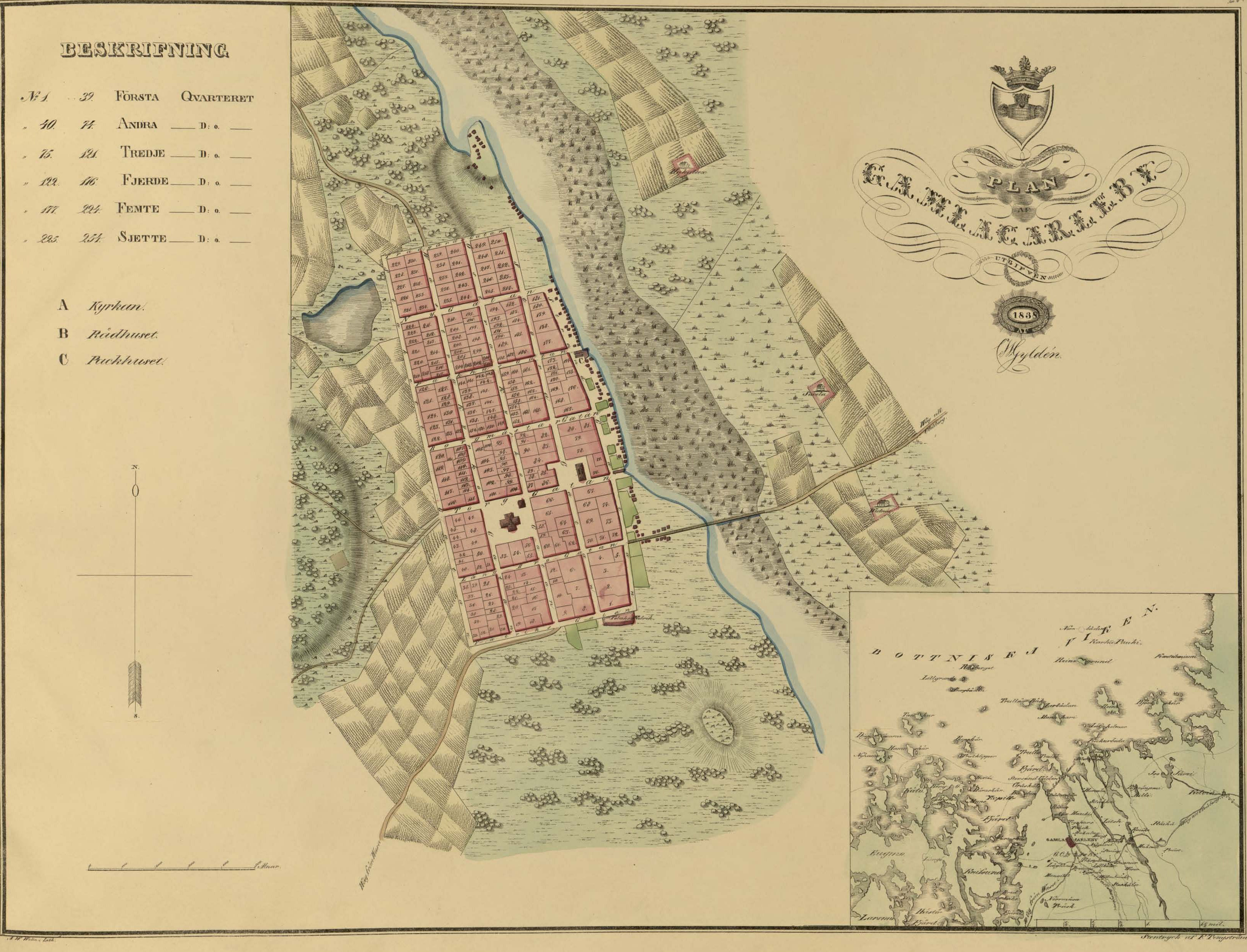 A. W. Welin, Lith. Stentryck af F. Tengström. PLAN af GAMLACARLEBY utgifven 1838 af C. W. Gyldén. |