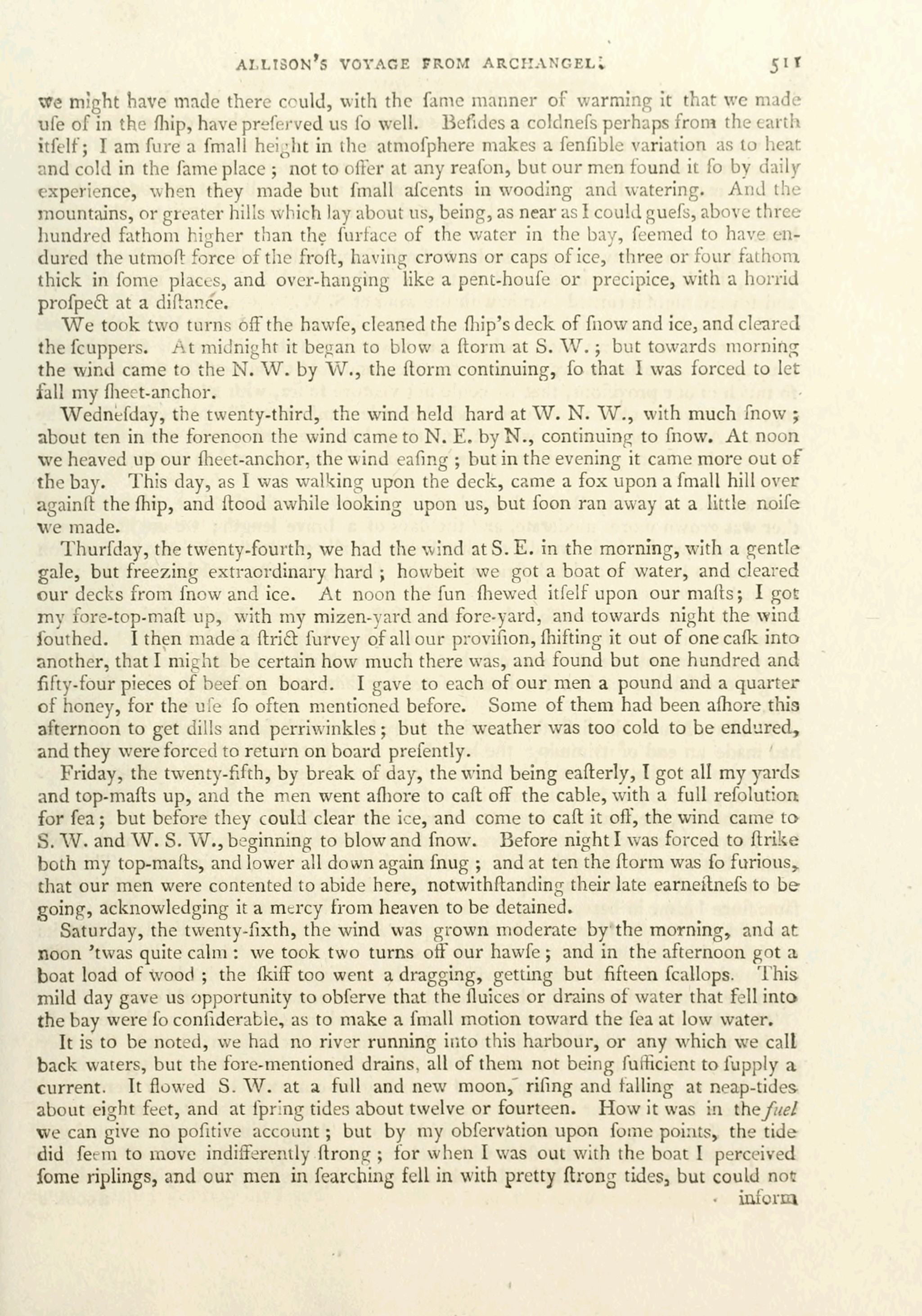 Wednefday, the twenty-third, the wind held hard at W. N. W., with much {now ;