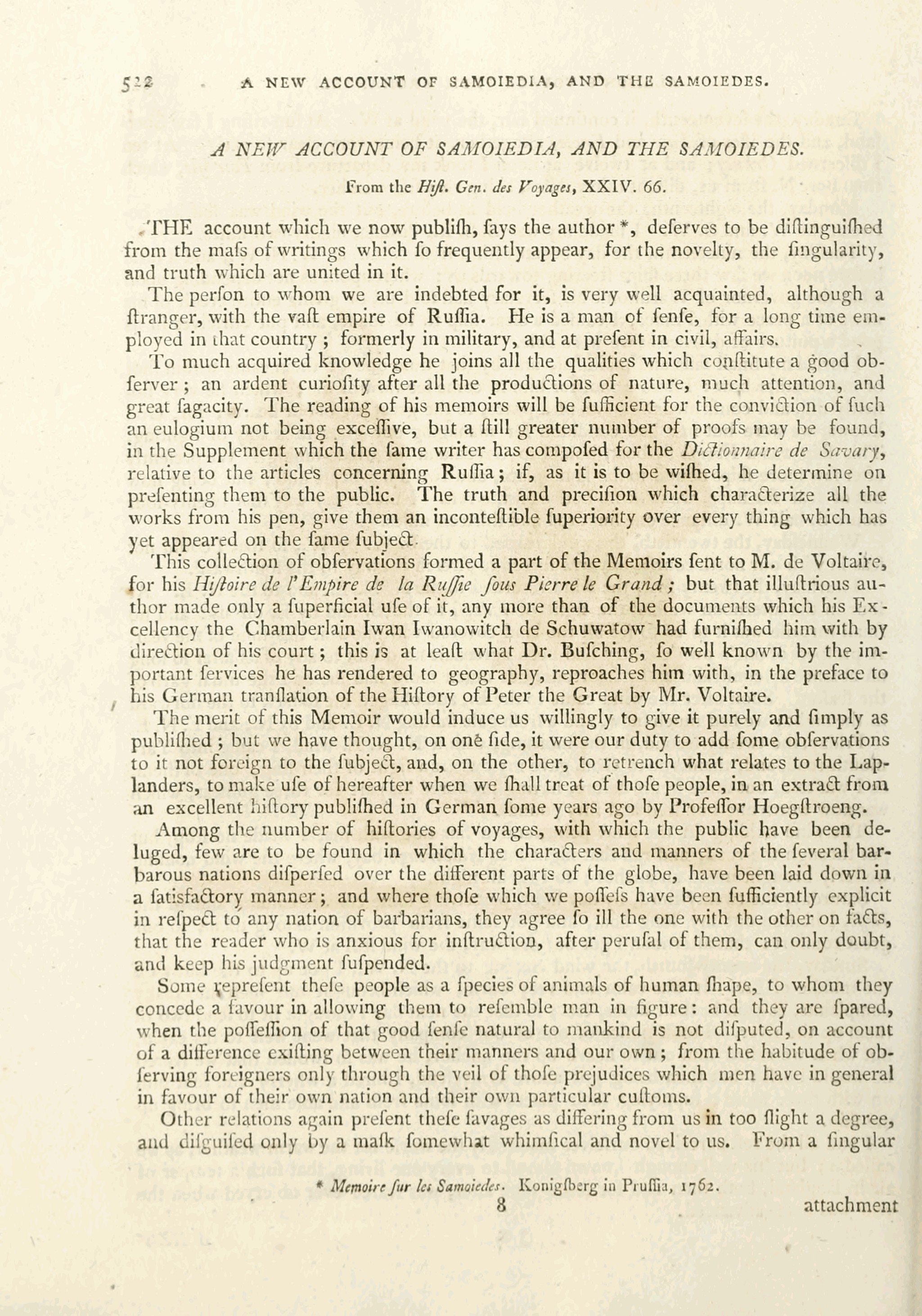 ® Memoire fur les Samoiedes. Konigfberg in Pruffia, 1762.