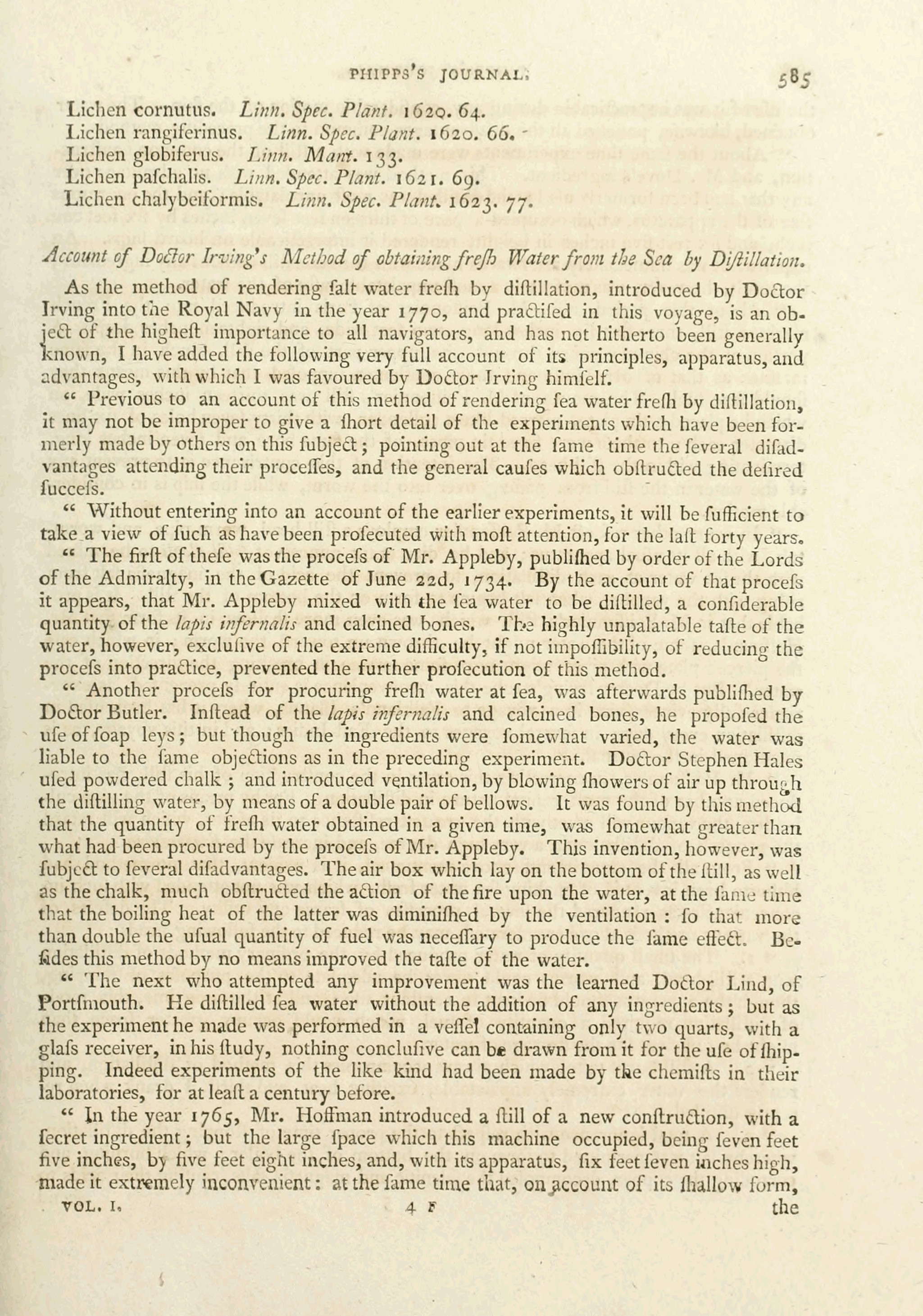 Account of Doctor Irving’s Method of obtaining frefh Water from the Sea by Diftillation.