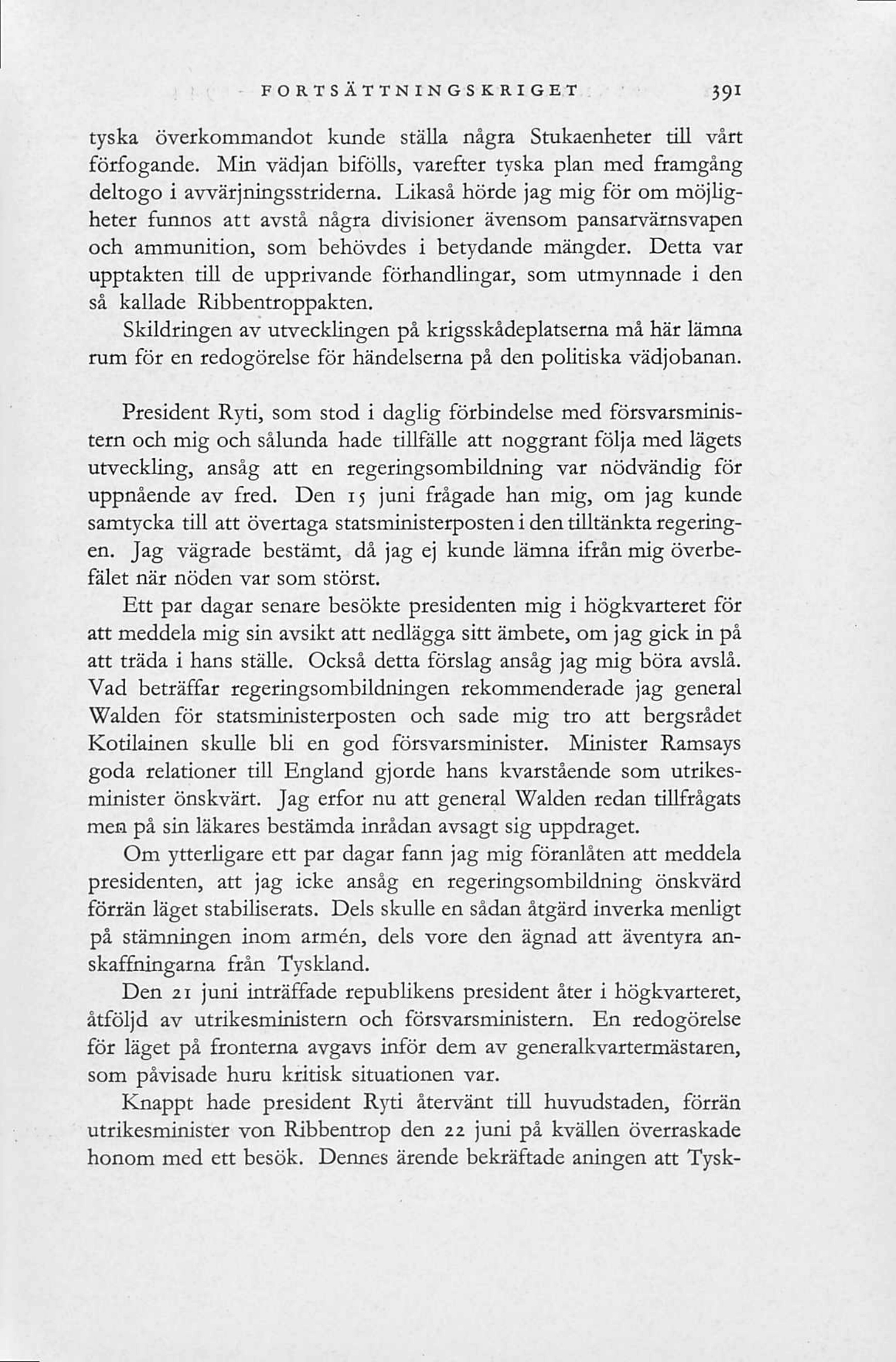 President Ryti, som stod i daglig förbindelse med försvarsminis-
